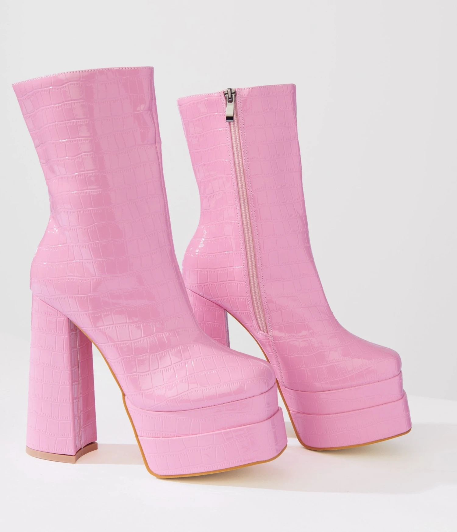 Designed to make a statement, these baby pink patent leatherette platform boots feature a trendy 2-inch platform and a stunning 6-inch heel. With their unique reptile embossed pattern, they add the perfect touch of fierce style to any outfit. The convenient side zipper ensures easy on and off while providing extra comfort. So why settle for ordinary when you can strut around in these fabulous beauties?