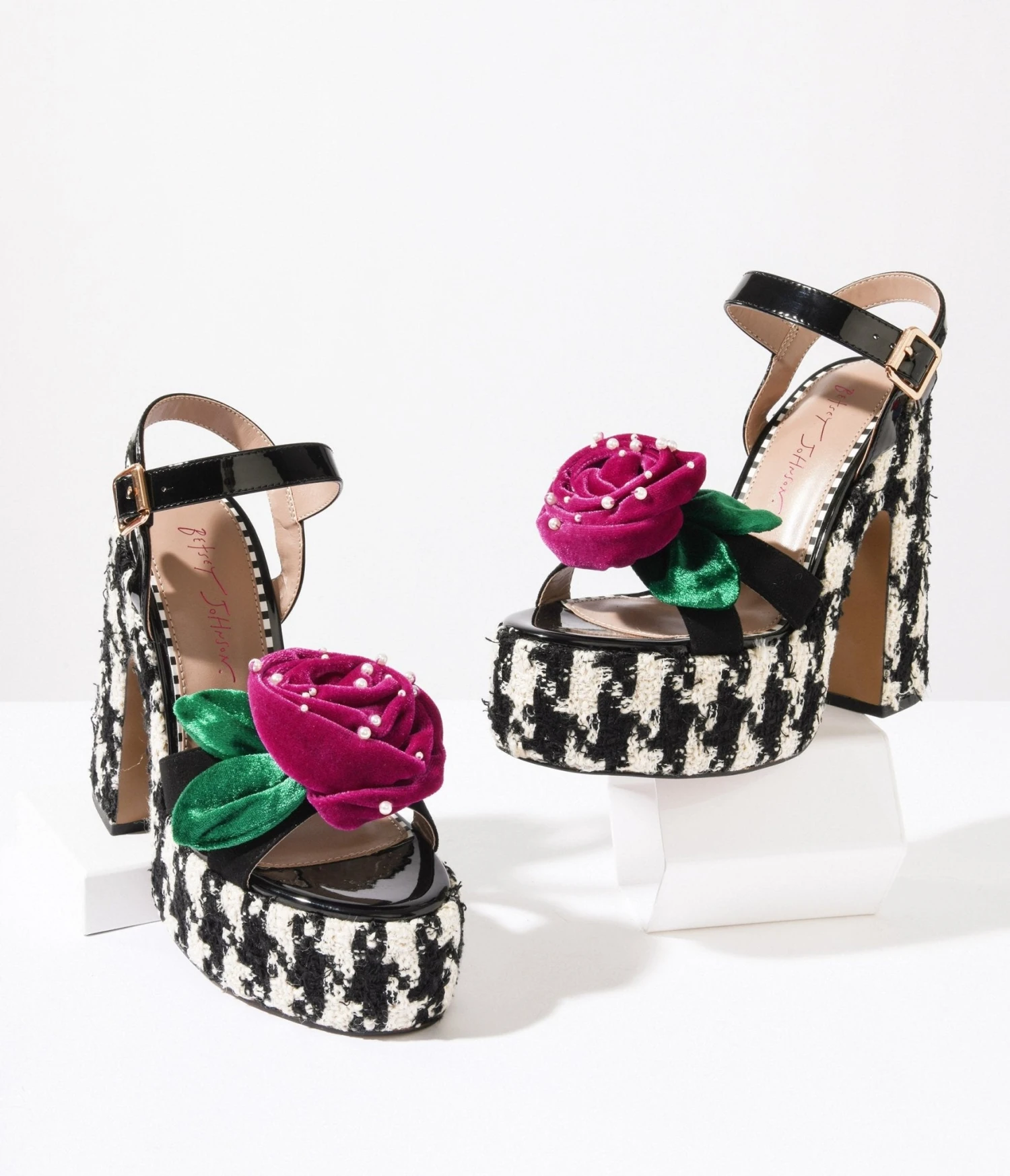 Step into a romance with these enchanting black and white houndstooth platforms from Betsey Johnson. Complete with a faux pearl accented velvet peep toe vamp, adjustable ankle strap, 2 inch platforms, and dramatic 6 inch heels.