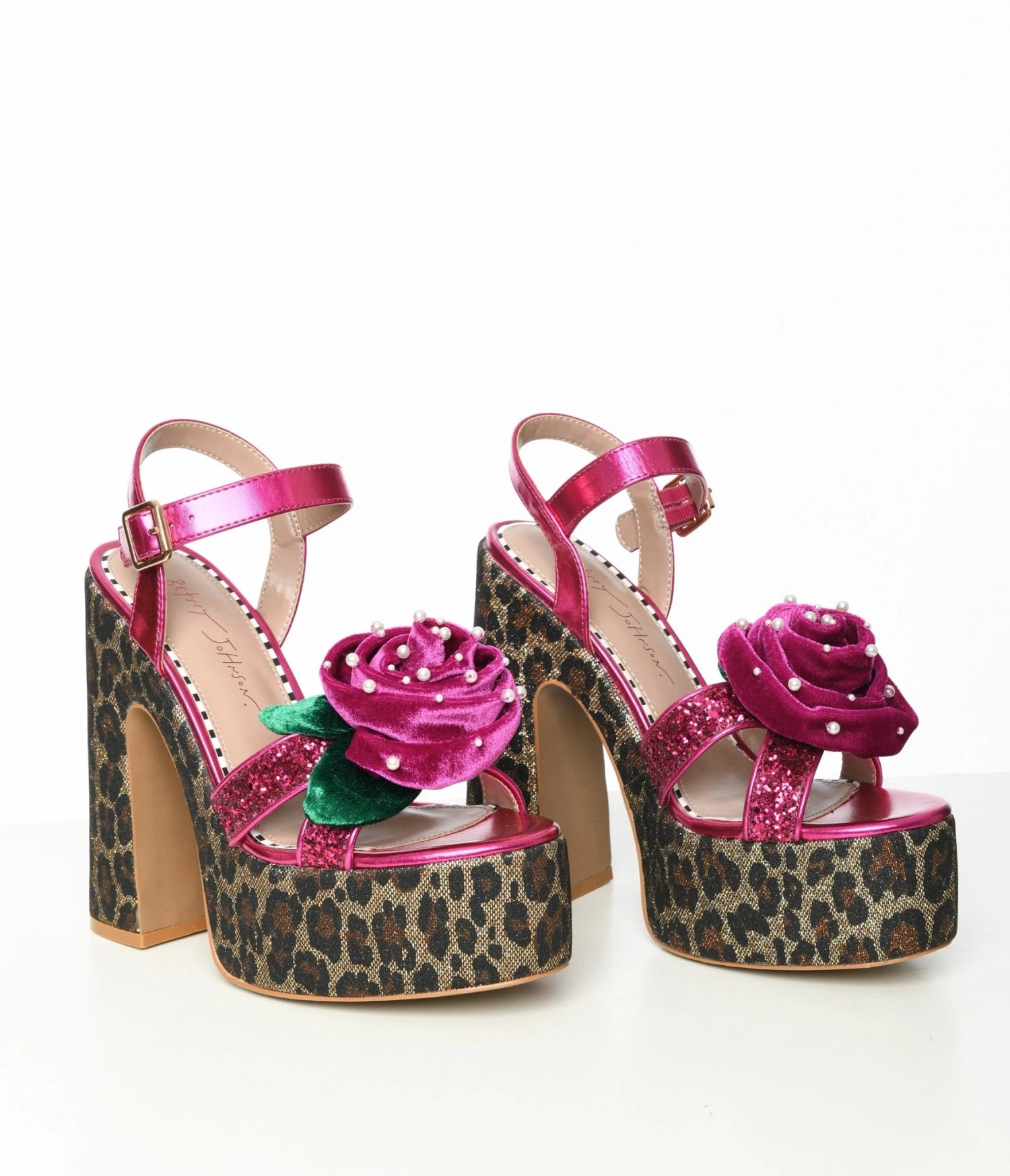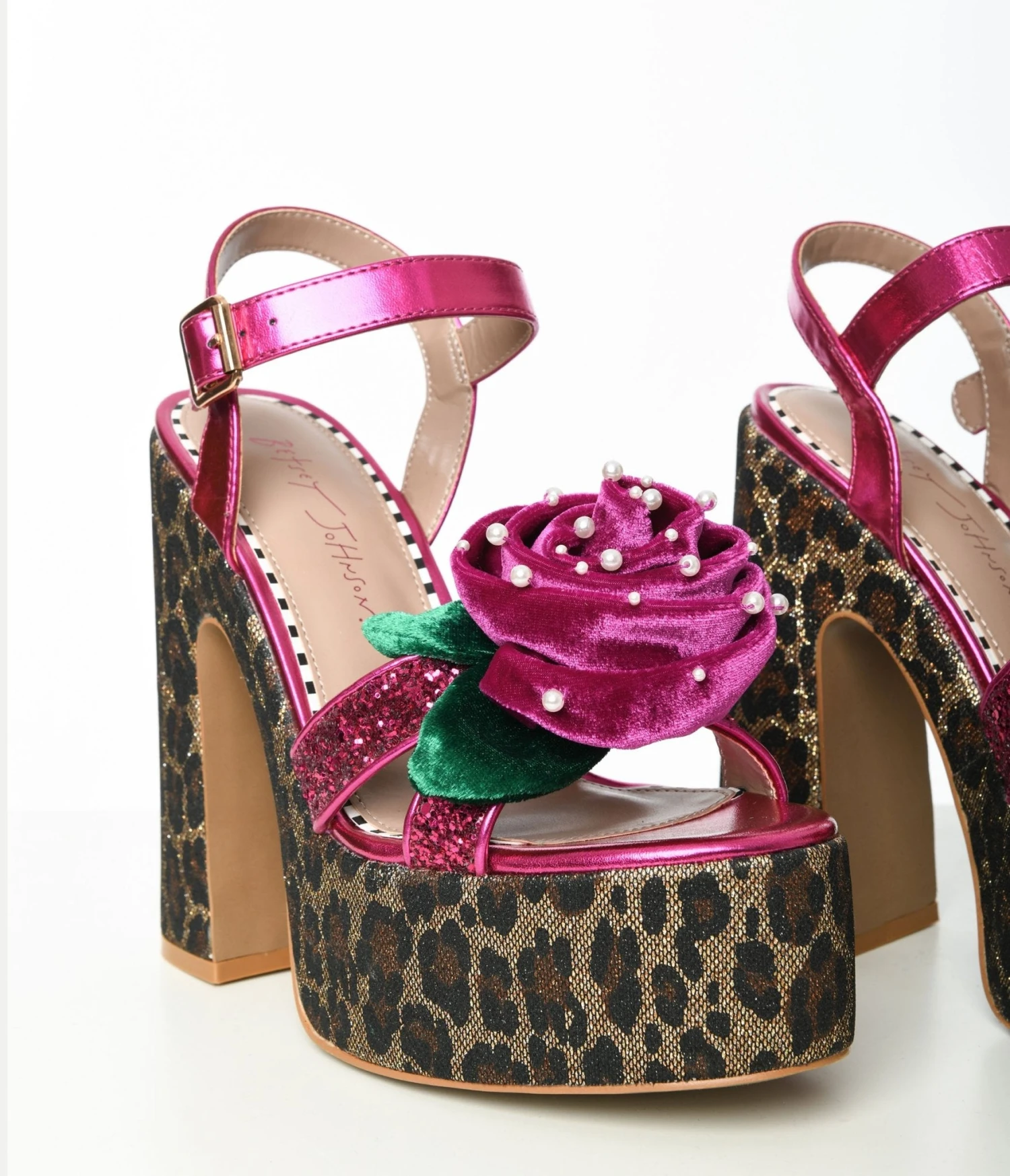 Step into a romance with these enchanting leopard print platforms from Betsey Johnson. Complete with a faux pearl accented velvet peep toe vamp, adjustable ankle strap, 2 inch platforms, and dramatic 6 inch heels.