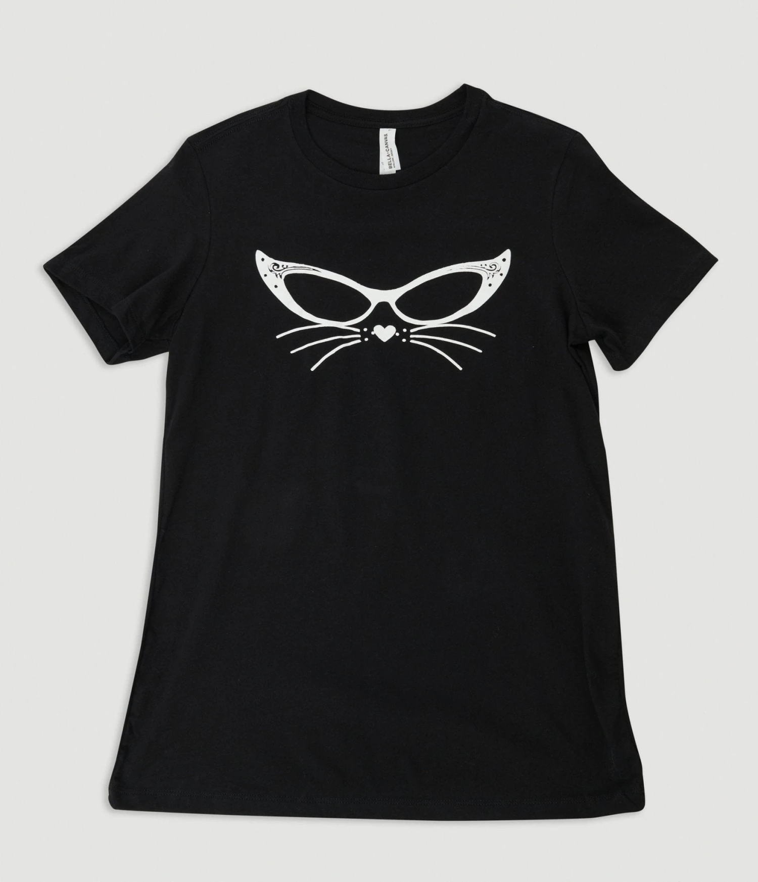 This unisex tee is crafted in a black cotton and features a graphic of white cat eye glasses with cat whiskers. Complete with short sleeves and unisex fit.