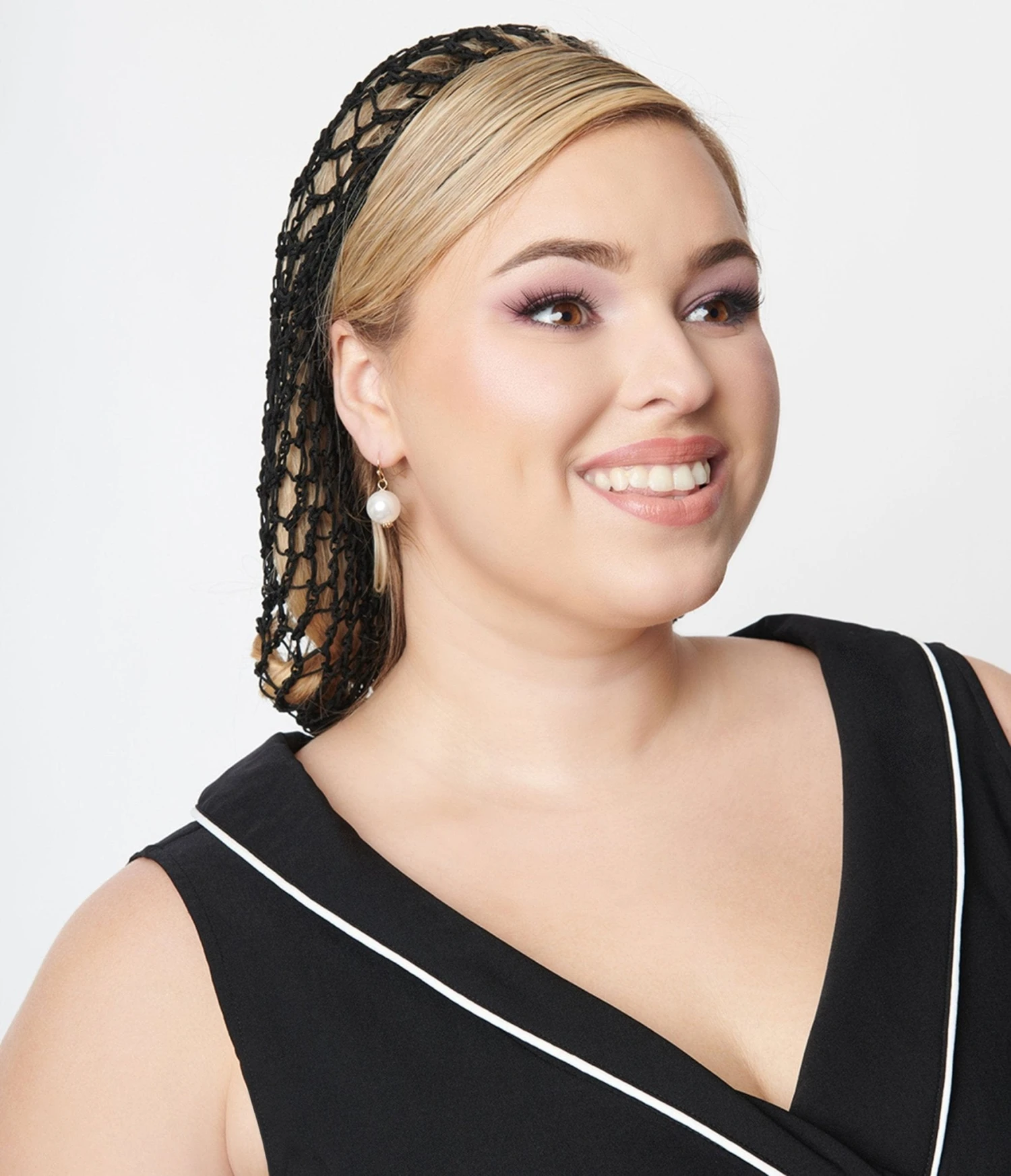 This retro black crochet style snood can be styled in a multitude of ways, with an open knit form and elasticized band for fit!