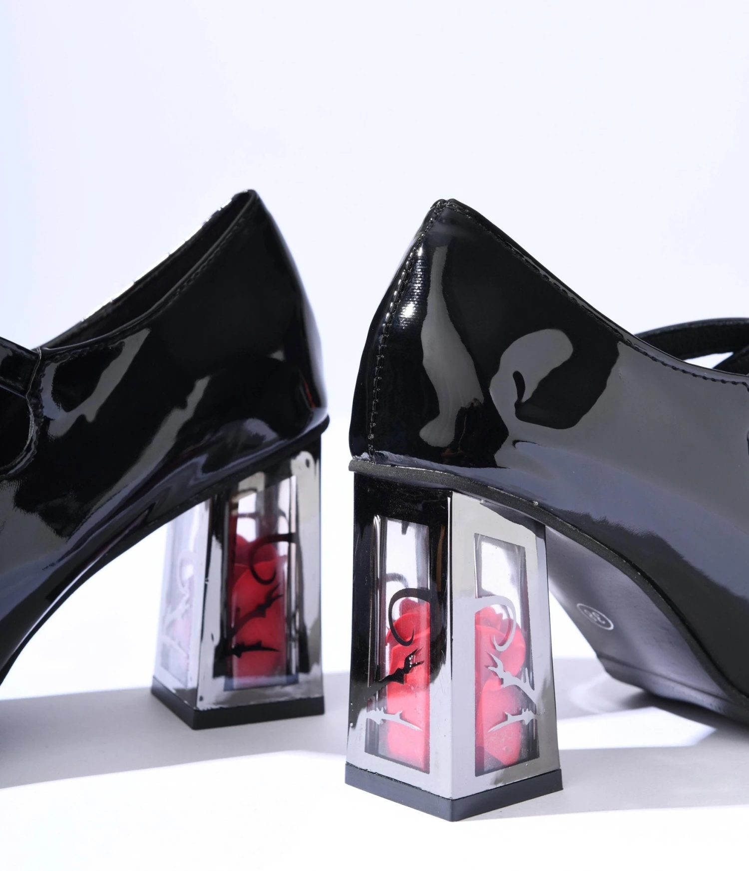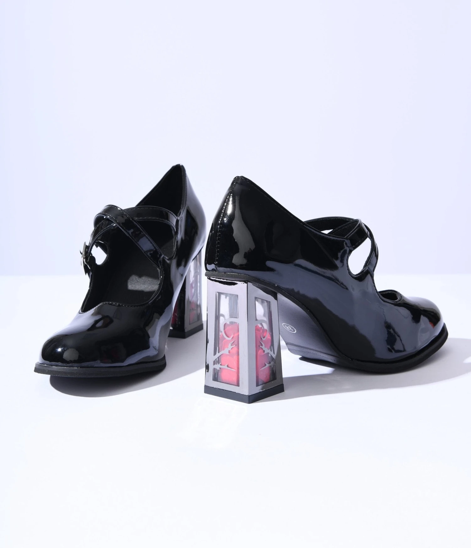 These striking black leatherette mary jane heels are the epitome of fierce femininity, boasting a seductive criss-cross strap that will make heads turn. Admire the captivating clear chunky heel, concealing an exquisite encapsulated rose within its depths, as if it were plucked from an otherworldly garden. Embrace your untamed spirit with the outer silver thorn print that emanates edgy glamour and adds a touch of rebellious charm to any outfit. With a comfortable 4 inch heel and an adjustable buckle, these heels effortlessly blend style with comfort for confident strides all night long.