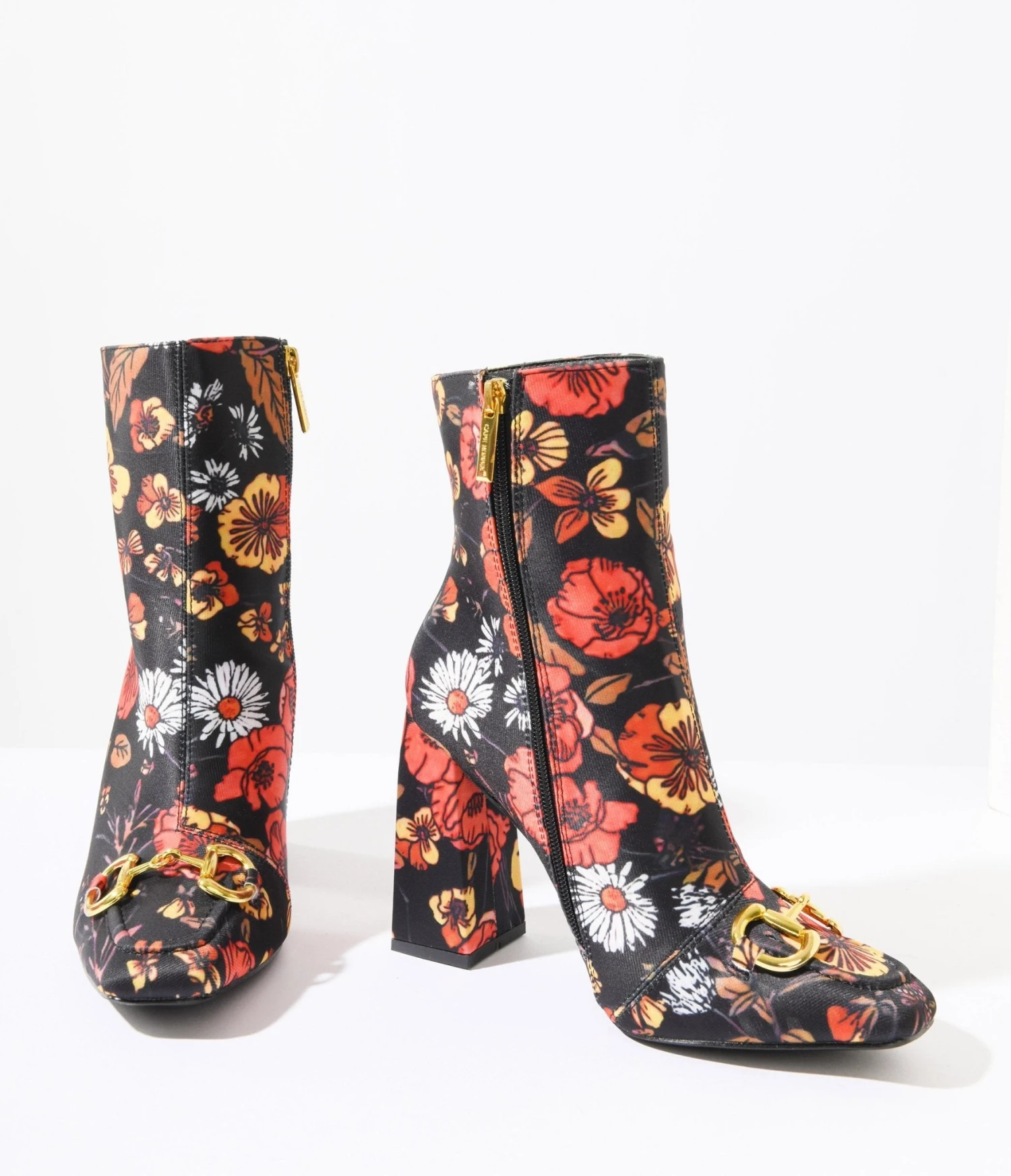 Step out in style with these charming black booties adorned with fall themed florals throughout and topped with a faux gold buckle on the toe. Complete with a side zipper and 4 inch heels.