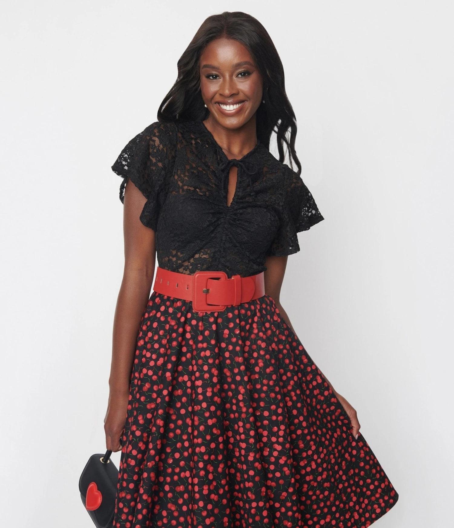This charming top is crafted in a sheer black lace knit. Outfitted with a ruched self-tie keyhole scoop neckline and framed with short sleeves.