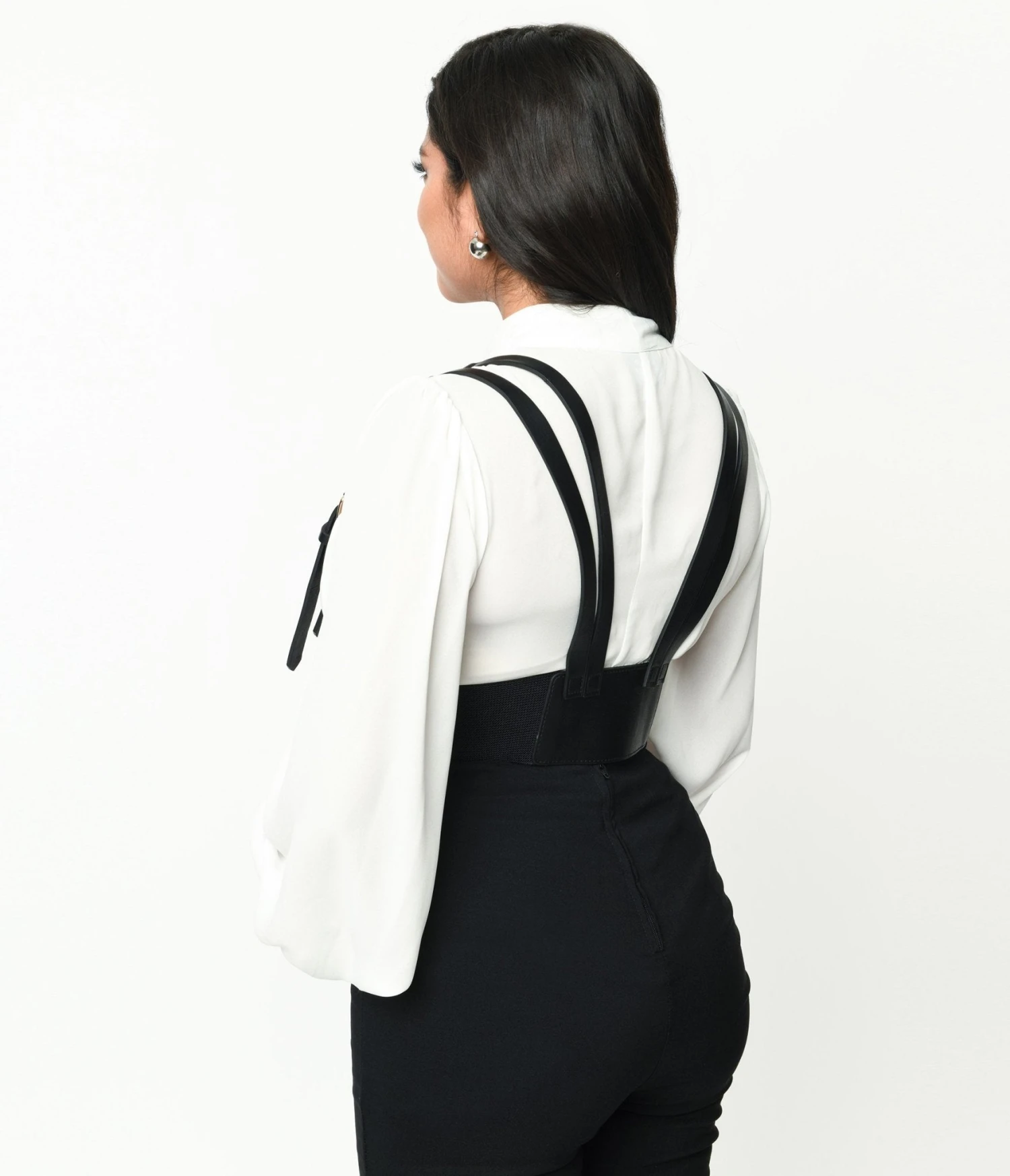 This retro inspired belt is crafted in black leatherette and features adjustable dual suspenders and a dual buckle adjustable waist.