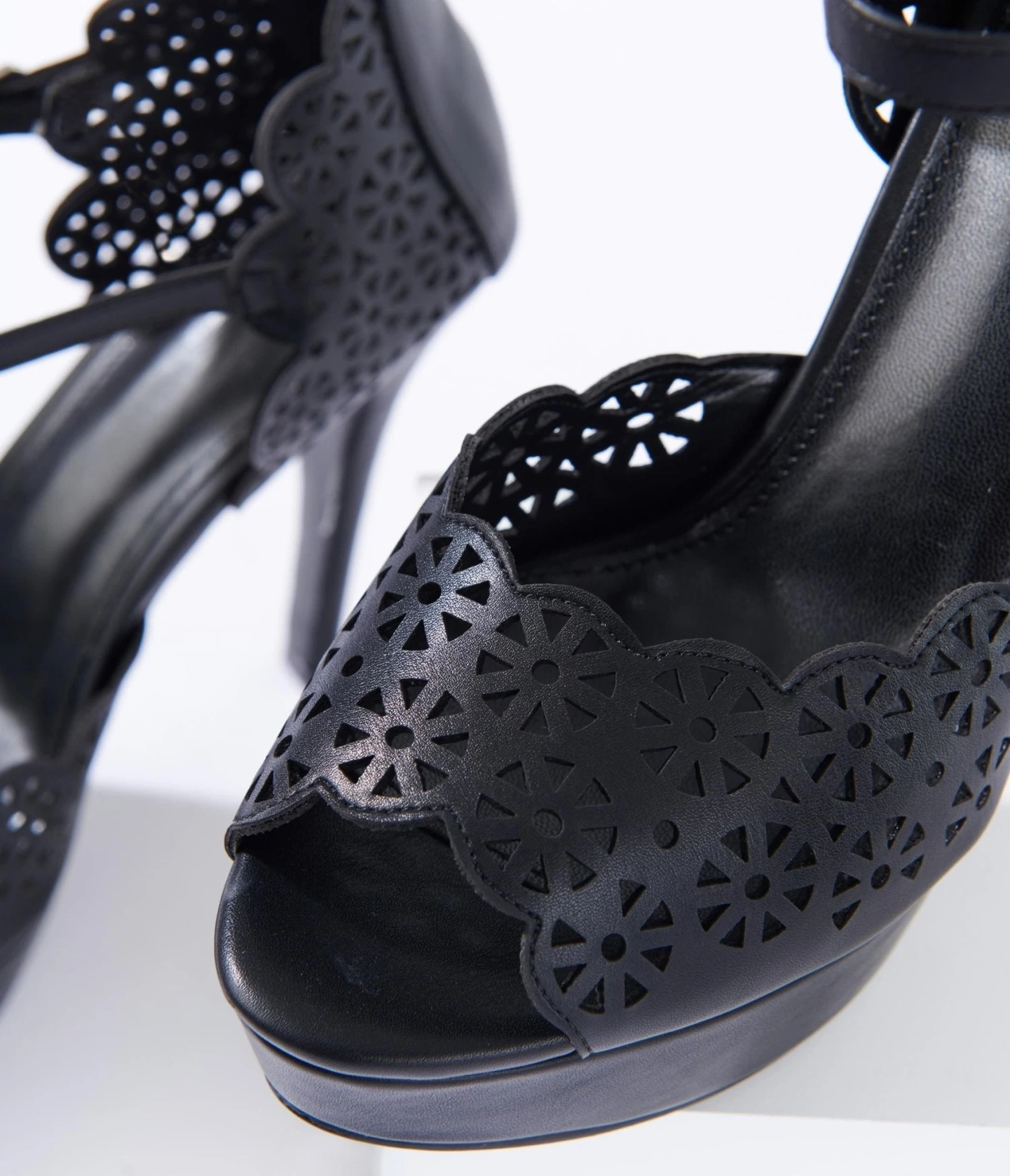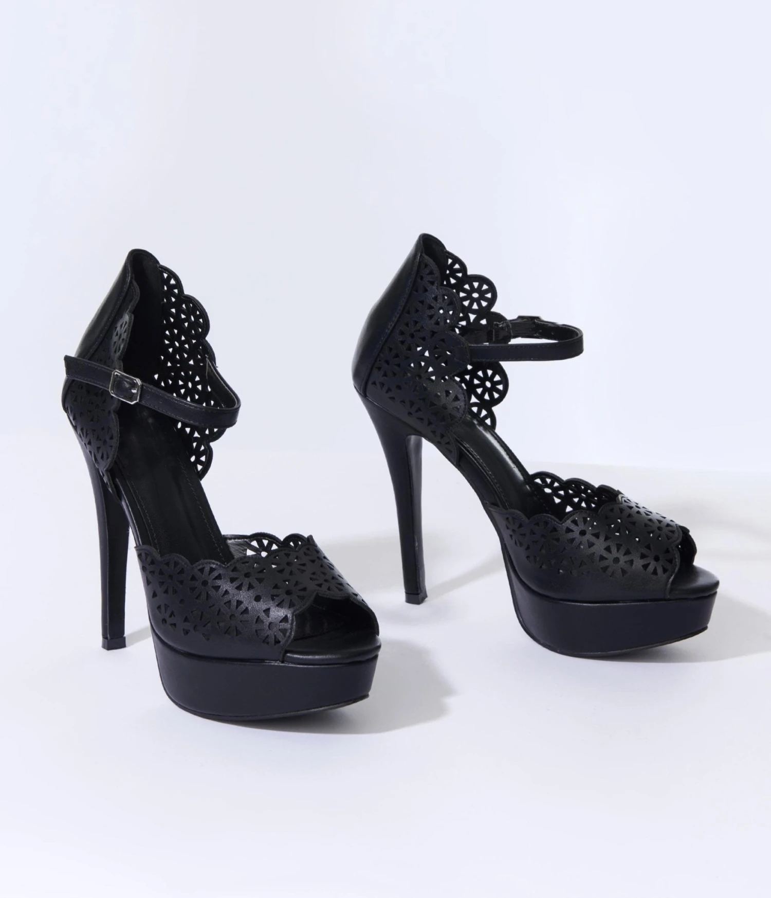 Complete your look with these eye-catching pair of platforms! Crafted in a black leatherette sporting a gorgeous perforated lace design. Complete with a 5 inch heel with a 1.5 inch platform and cushion insole and adjustable ankle strap for extra security!