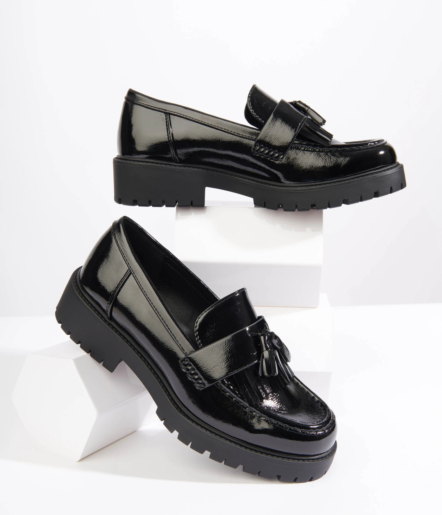 These retro chunky loafers are crafted in a black patent leatherette and boasts a 1.5 in heel and classic loafer styling.