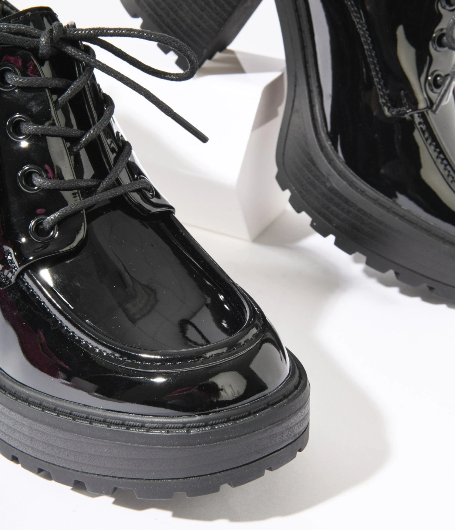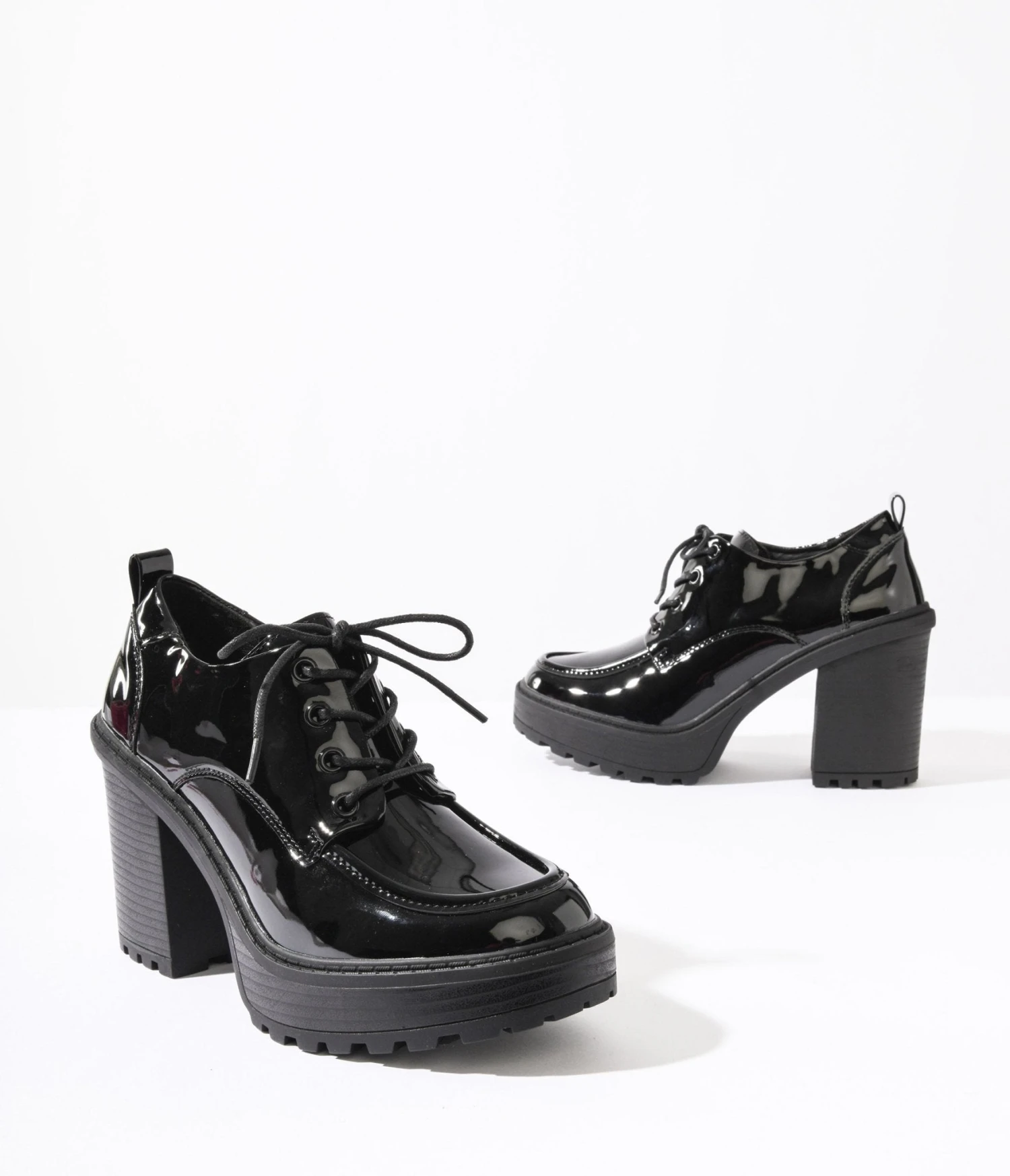 Get ready to turn heads and make a bold fashion statement with these black patent leatherette platform Oxford heels! Complete with a lace-up front, rounded toe vamp, 1 inch platform, and 4 inch heels.
