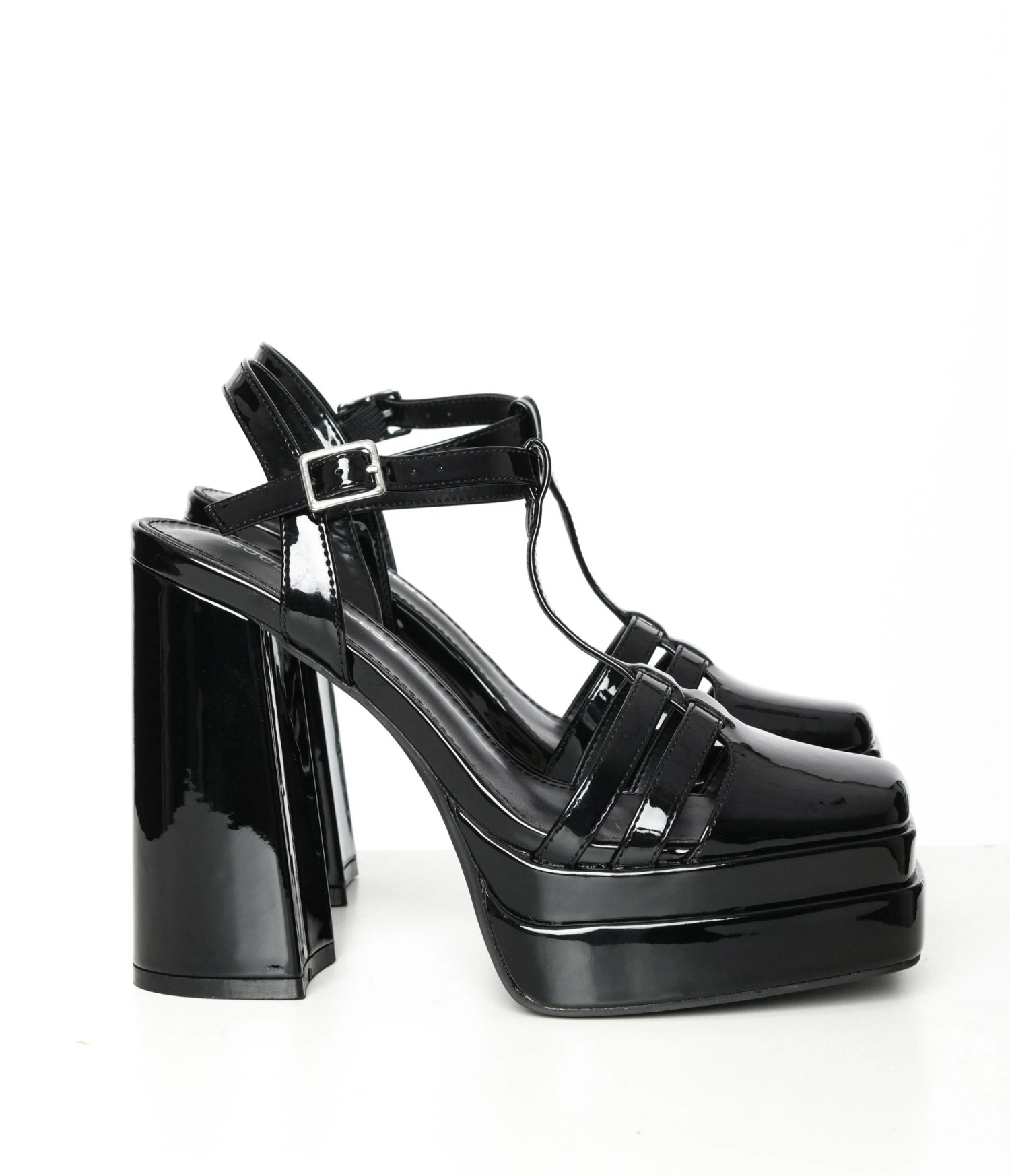 Step into the spotlight with these black patent leatherette platform heels! Complete with an adjustable ankle strap, closed toe, 1 inch platform, and 5.25 inch heels.