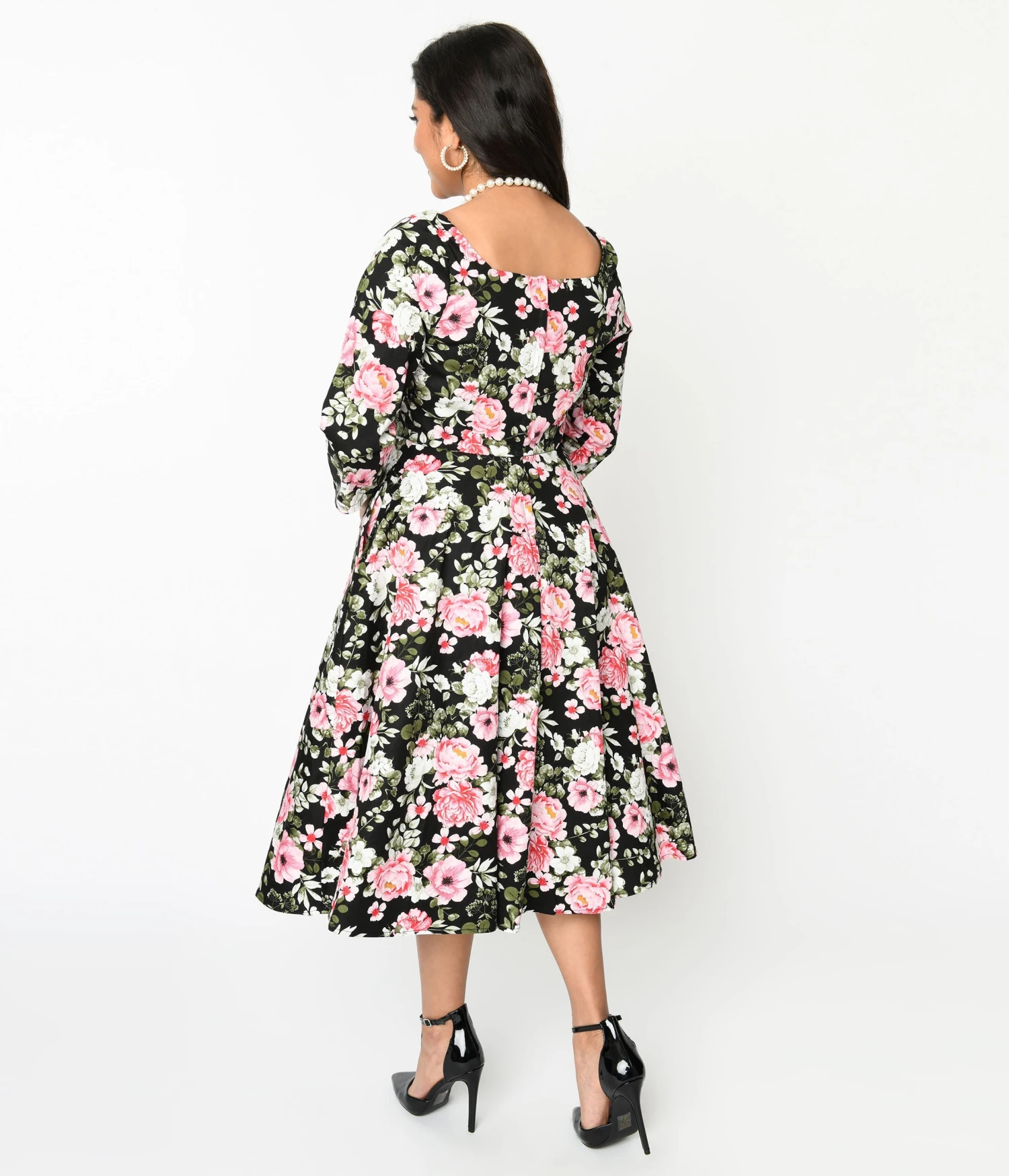 This 1950s inspired swing dress features a classic black design adorned with beautiful pink florals that will surely make you stand out from the crowd. The square neckline and quarter-length sleeves add a touch of elegance, while the side pockets offer convenience and functionality. With a back zipper for easy wearing, this dress is both fashionable and comfortable.