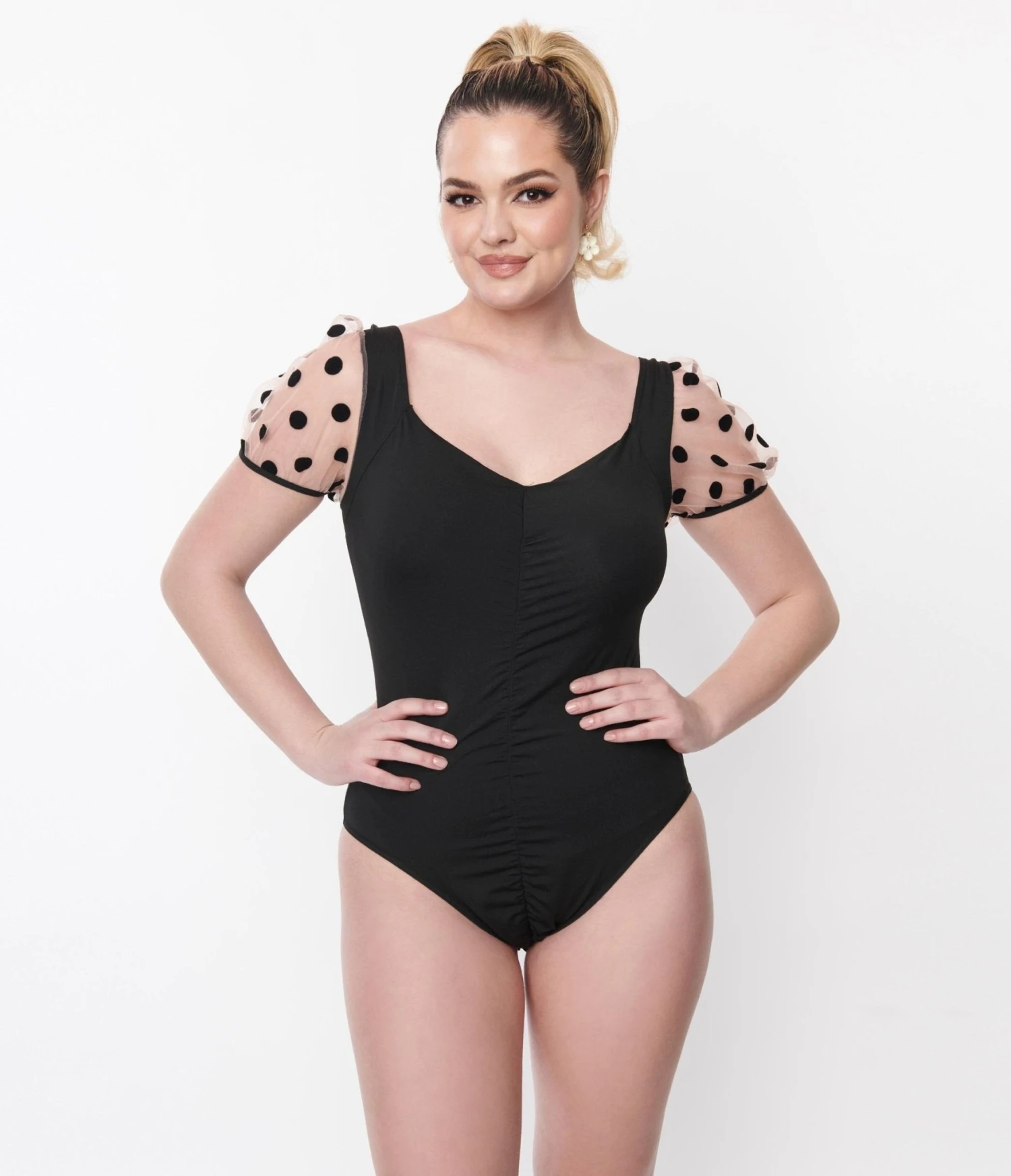 This stylish black bodysuit features eye-catching, short sleeves made with pink and black polka dot mesh for a unique and playful touch. The black body of the top is made of soft, knit fabric that will move with you throughout the day and features snap closures to keep in place. Complete with a deep scoop back and v-neckline.