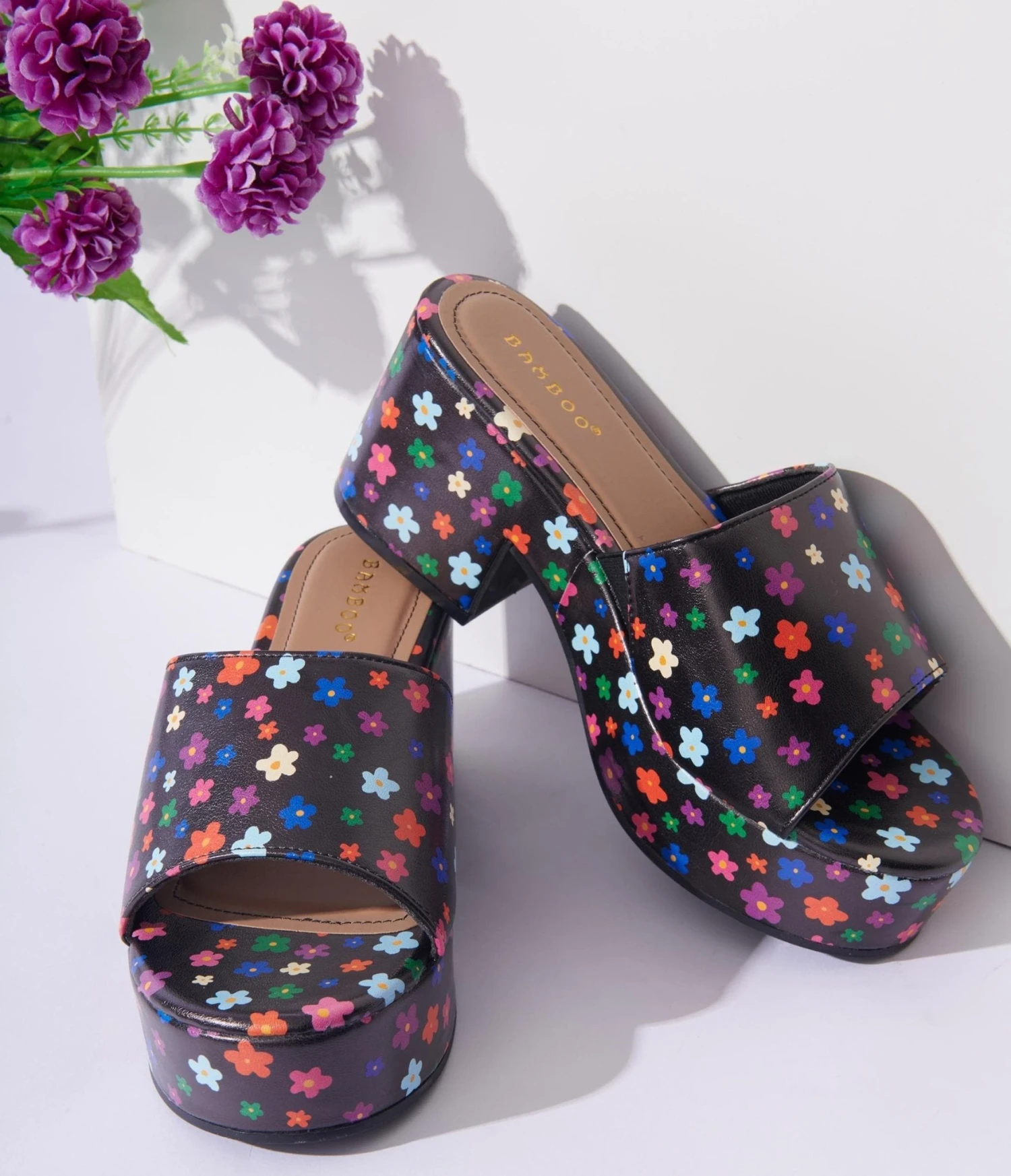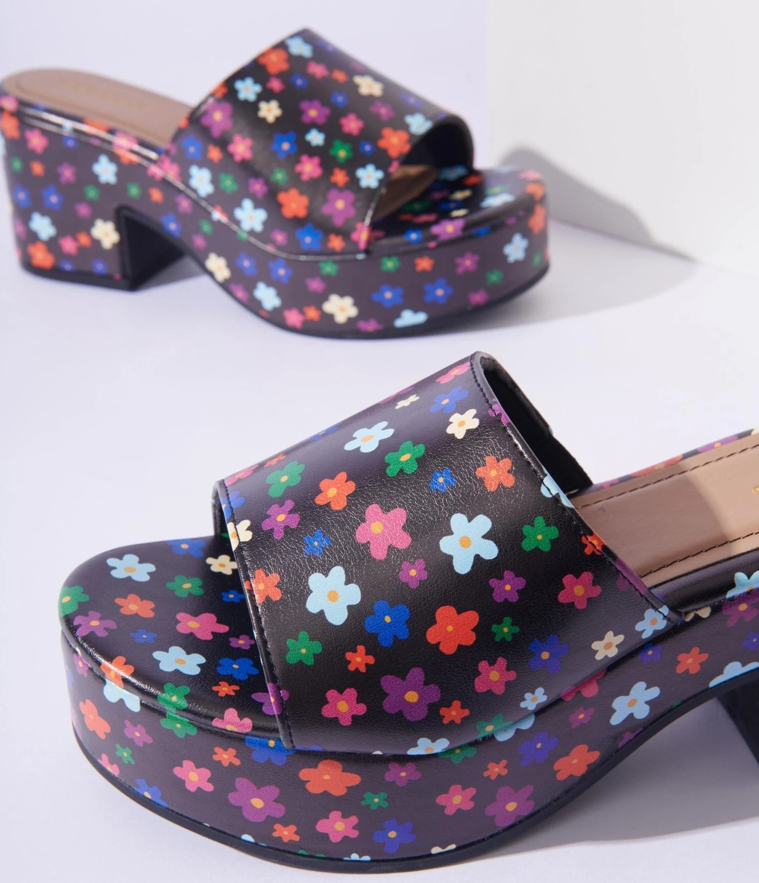 These adorable 1970’s style mules are crafted in a black leatherette and feature rainbow florals throughout. Complete with an open toe front, 1.5 inch platform and 3 inch heel.