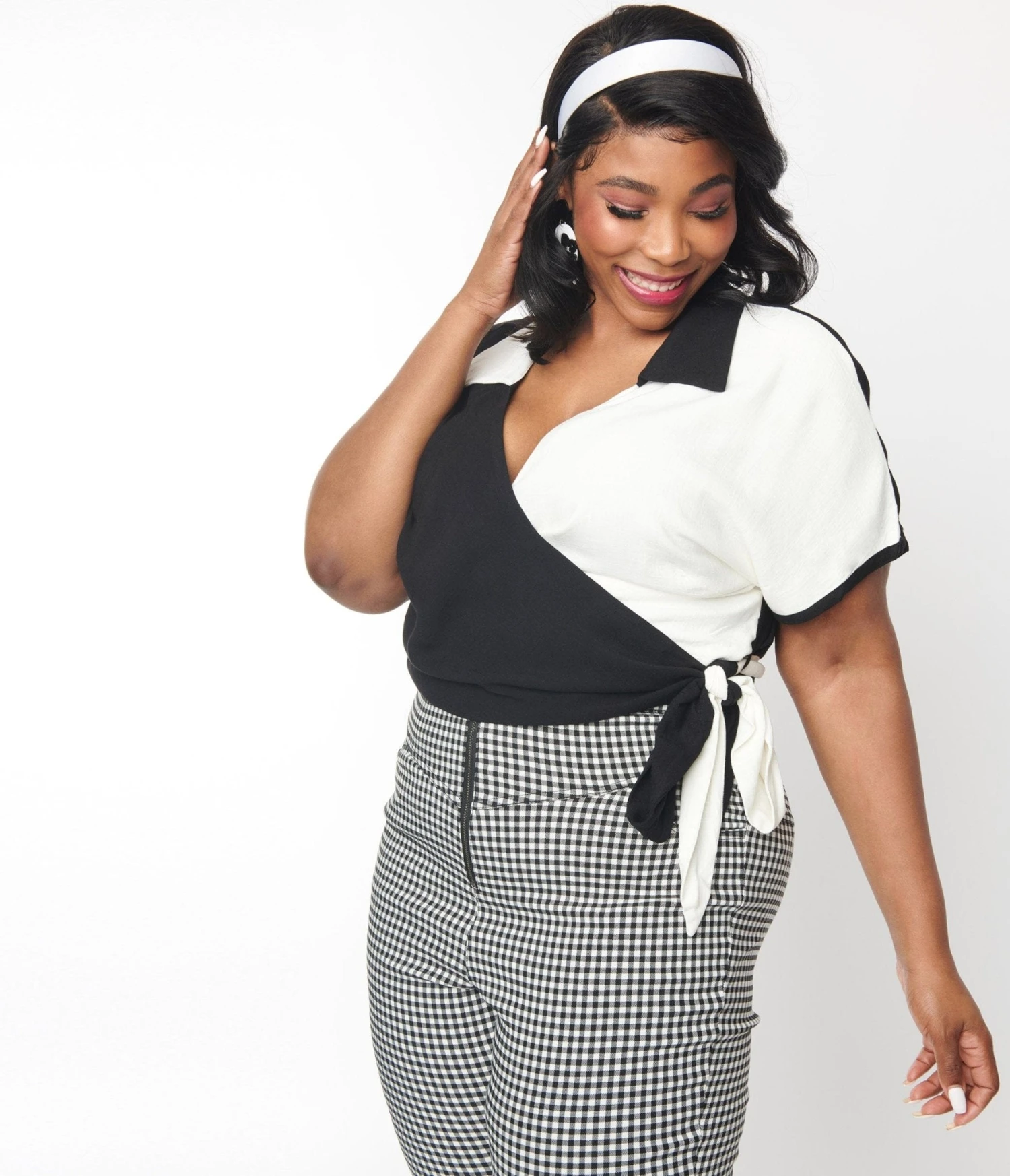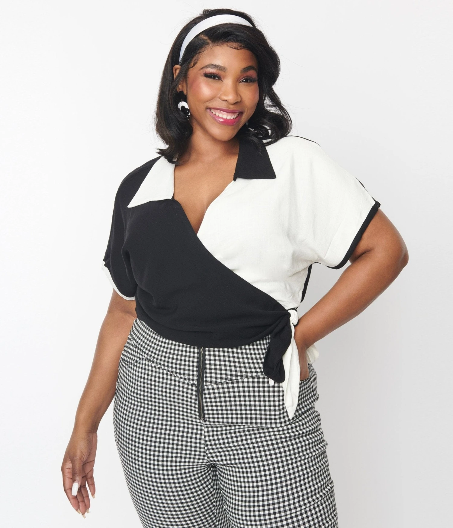 This charming bowler style wrap top is crafted in a black and white colorblock woven. Outfitted with a collared surplice neckline and a self-tie wrap.