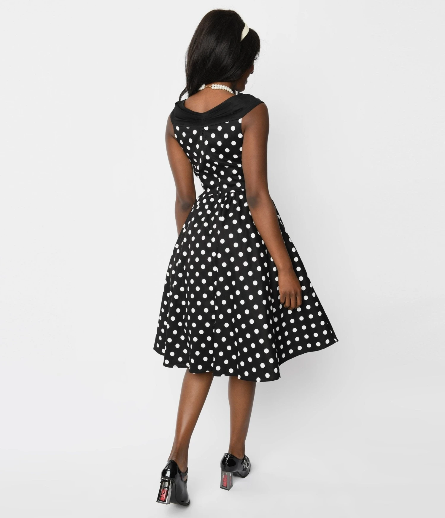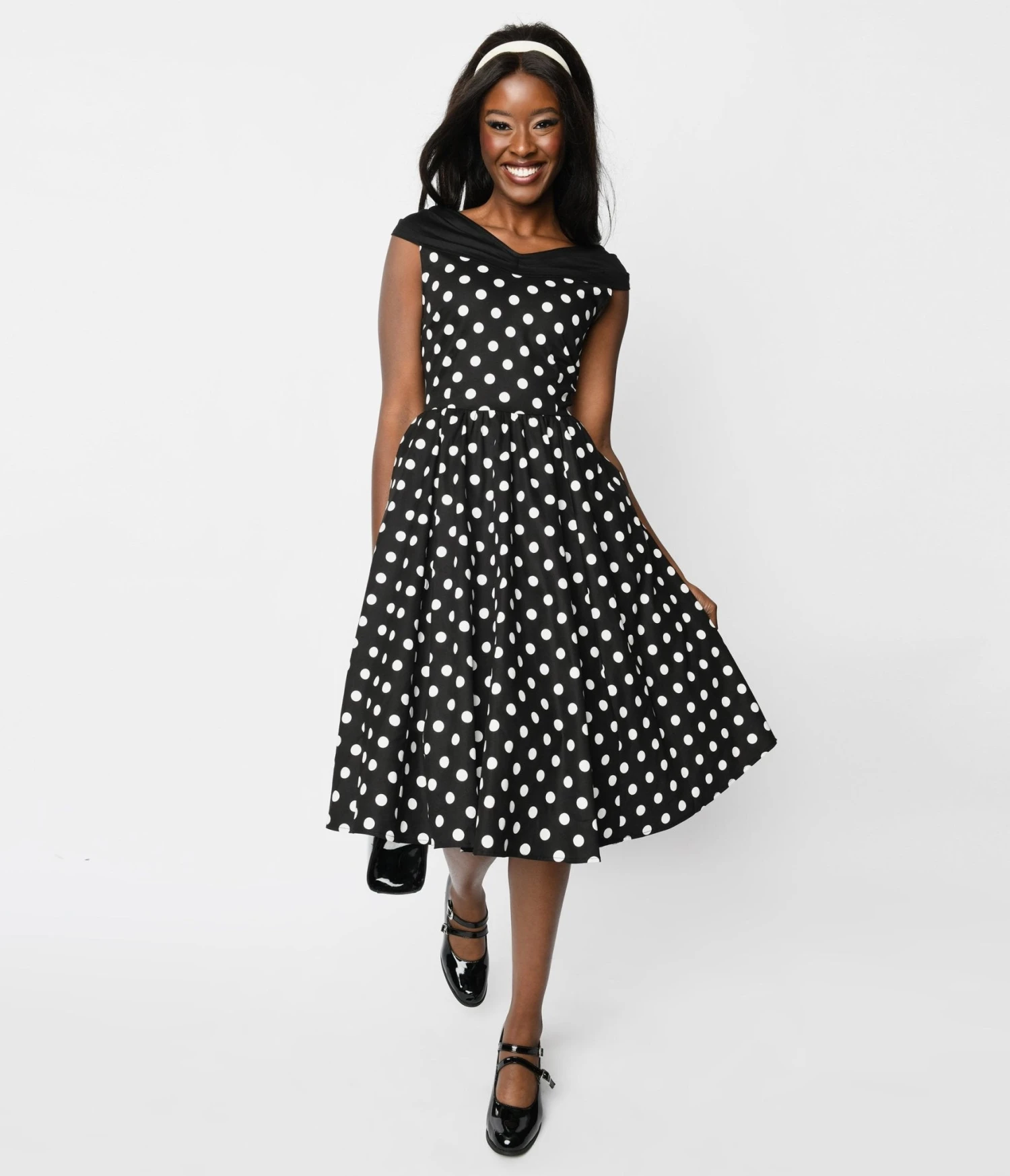 This flirty and feminine number is all about embracing your playful side. Featuring a ruched black off the shoulder boat neckline, it effortlessly combines elegance with just the right touch of sass. The mid-back zipper ensures a sleek fit while the side pockets add practicality to this fashion-forward piece. With its timeless black and white polka dot pattern, this swing dress is perfect for creating effortless style that exudes confidence wherever you go.