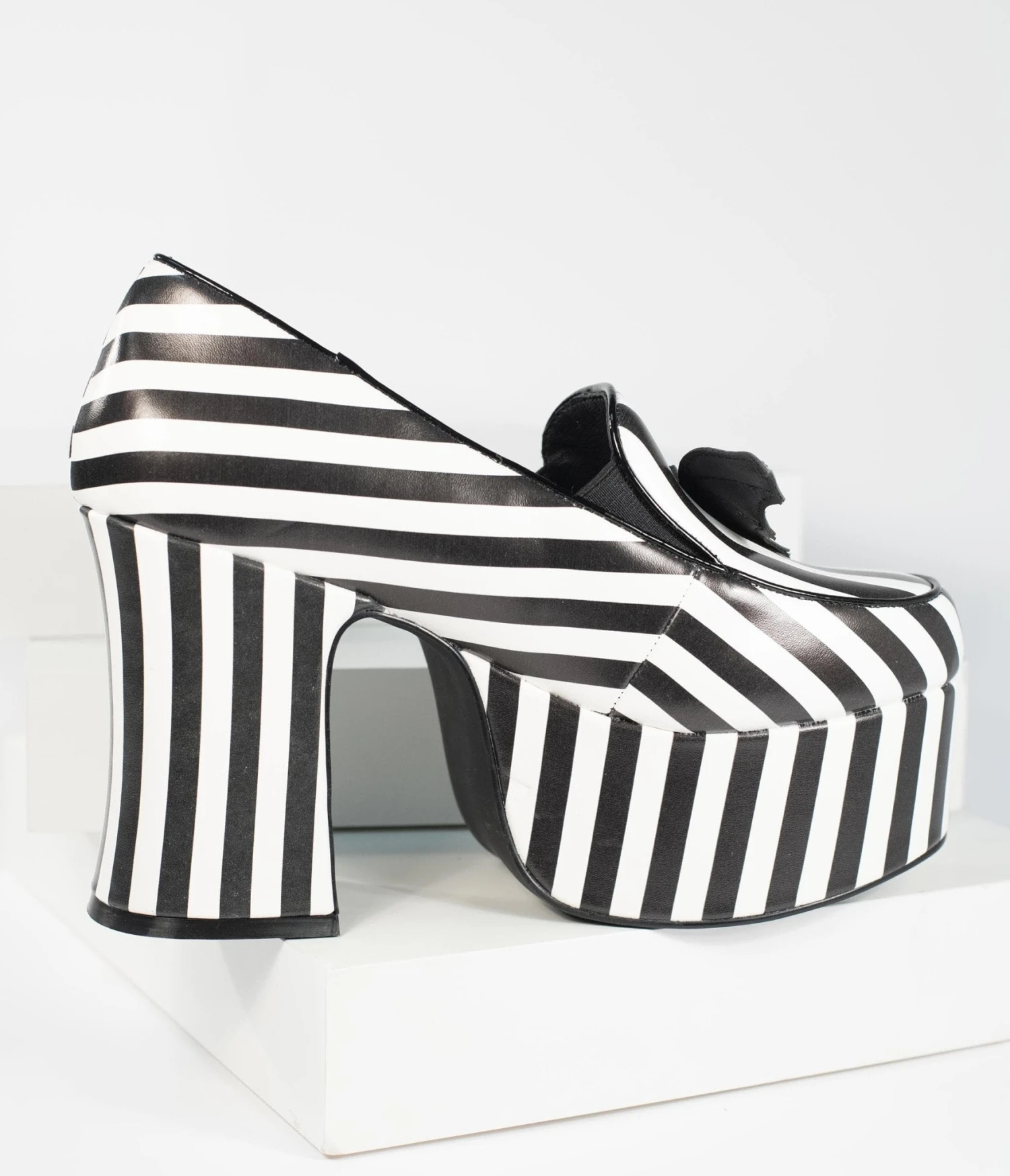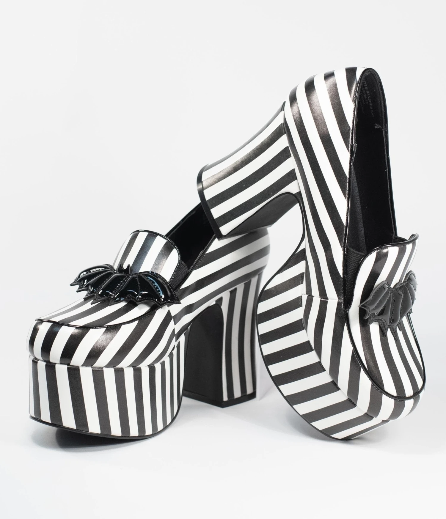 You’re in a wild mood tonight, darling! These stunning platforms are crafted in a hypnotizing black and white stripe leatherette and boast a stunning 4.5 inch heel and 2.5 inch platform. The adorable loafer vamp dances with a black patent leatherette bat for oodles of spooky delight!