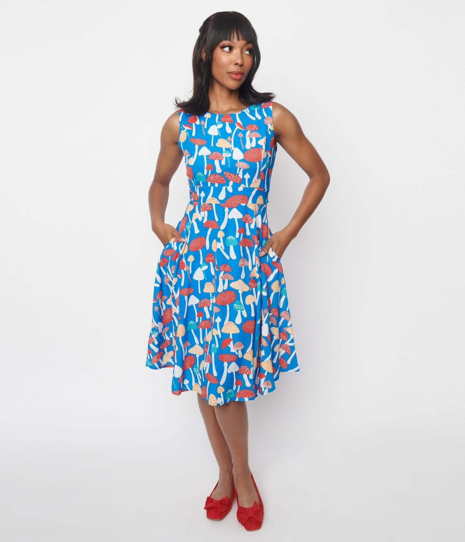 Crafted from a blue woven crepe fabric, this dress is the epitome of chic and comfort combined. The fit and flare style effortlessly enhances your natural curves while providing a flattering silhouette. But let’s talk about the real star here – the adorable allover mushroom print! These cute little fungi add a touch of whimsy to your look. The flattering scoop neckline combined with the sleeveless design keeps you cool on warm days or allows for layering during colder seasons. While the attached self ties gives you flexibility in styling options. And guess what? This dress even comes equipped with convenient side pockets and a back zipper closure.