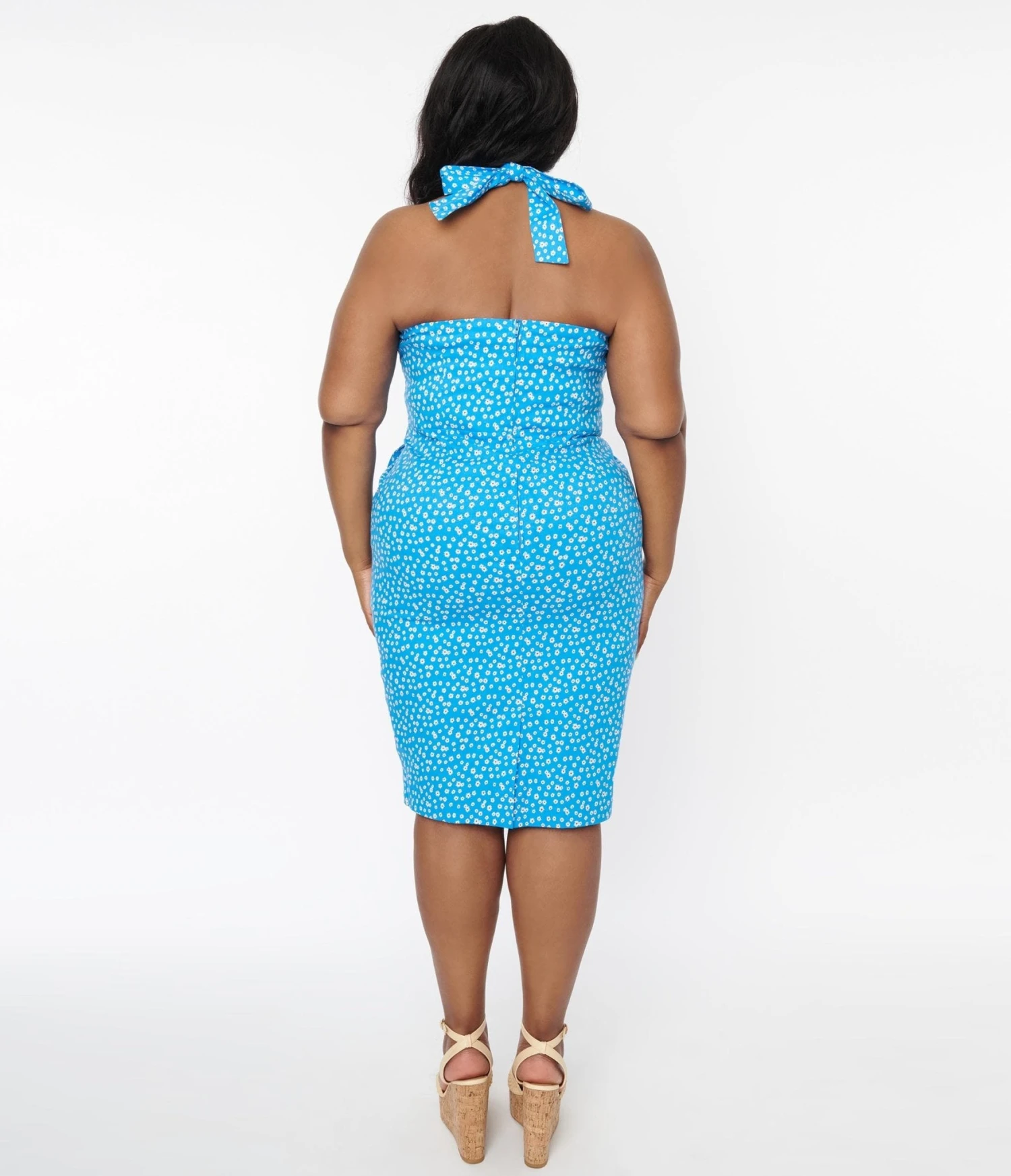 This stunning 1950’s style wiggle halter dress is crafted in a light blue woven with white daisies throughout. This dress is perfect for summer outings, weddings, or any special occasion. The halter top complements the feminine floral pattern of the dress, making it a must-have for any fashionista’s wardrobe. Complete with side pockets, back vent and back zipper.