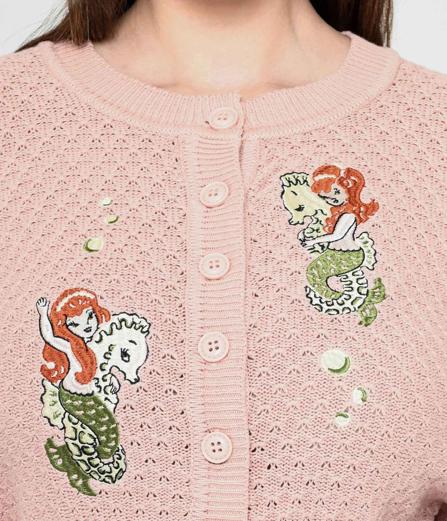 Get ready to make a splash! This adorable 1950s style knit cardigan is perfect for adding a touch of whimsy to any outfit. In a dreamy blush pink color, it features two playful mermaid sisters and a couple of seahorses embroidered on the bodice – talk about magical! With its quarter sleeves and button-down front, this cardigan is both cute and practical. The scoop neckline adds a feminine touch that will have you feeling like an enchanting mermaid wherever you go.