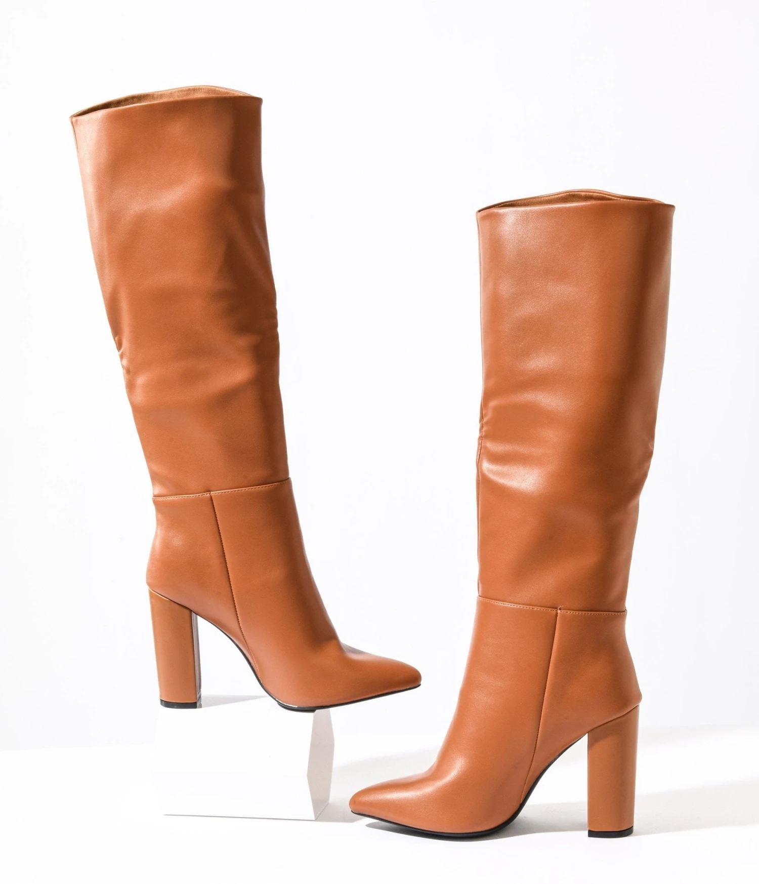 Crafted in brown leatherette, these pull on knee-high boots feature a 4 inch heel, 13 inch shaft, and a cushion insole.