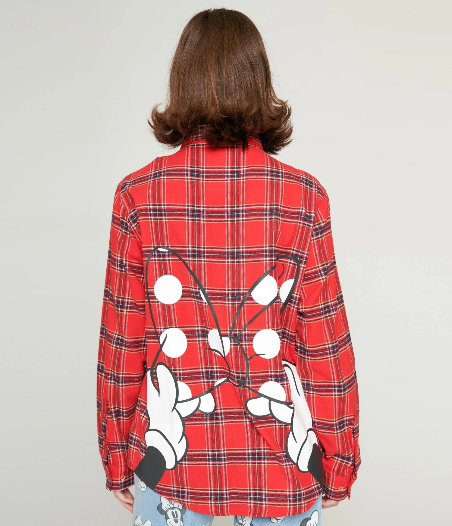 This charming flannel from Cakeworthy is crafted in a cotton red plaid and boasts a graphic print of Minnie Mouse’s hands and bow on the back. The classic collar features “Minnie” embroidered in white.