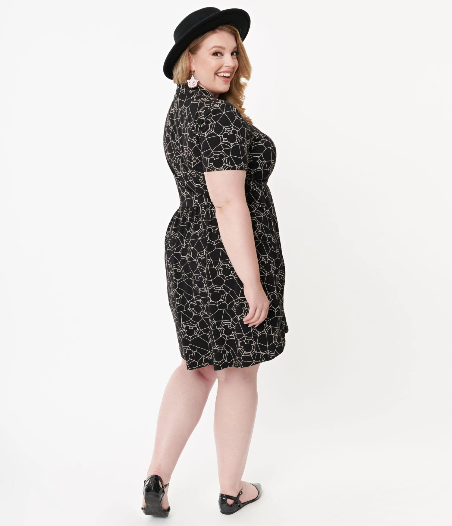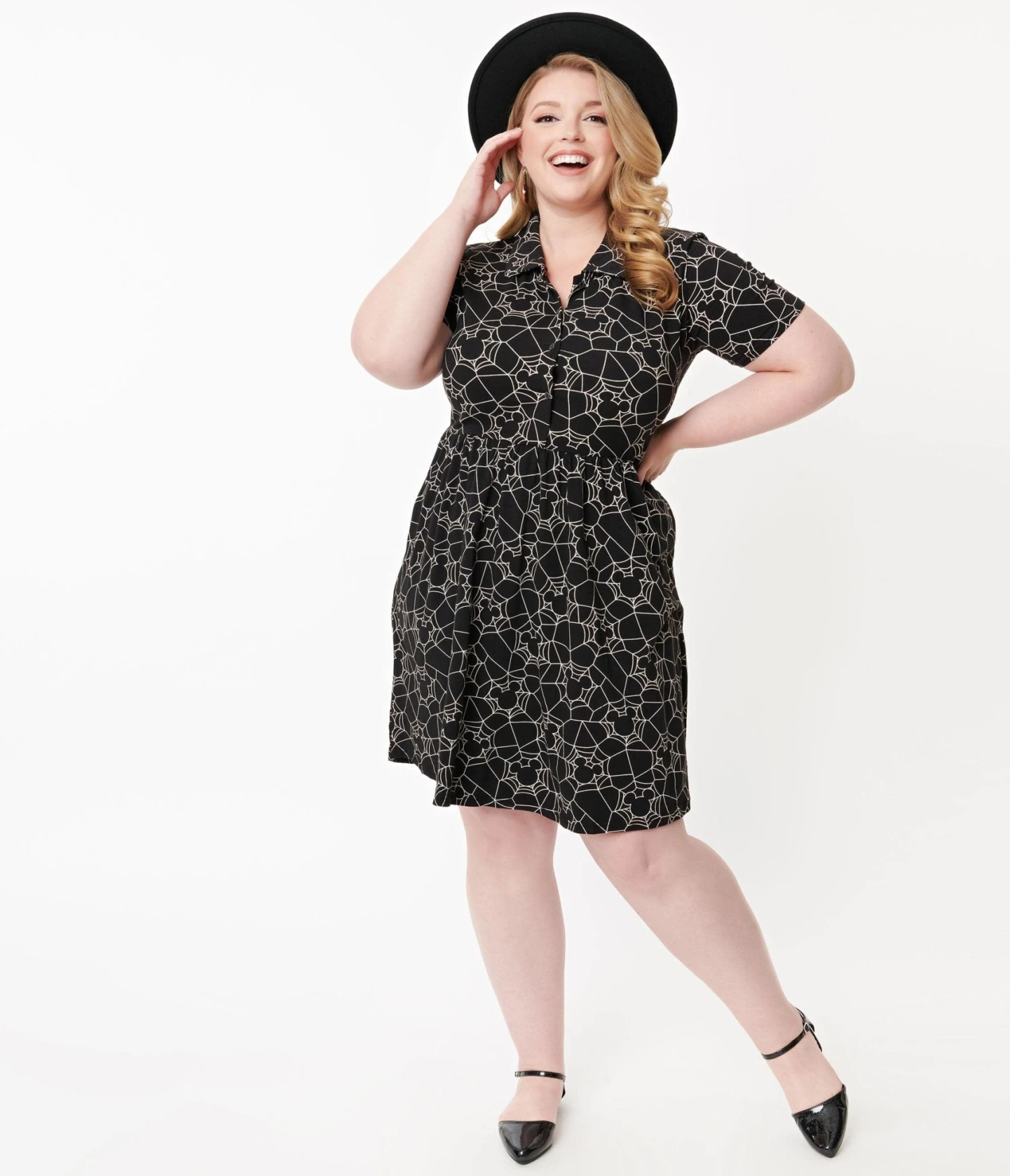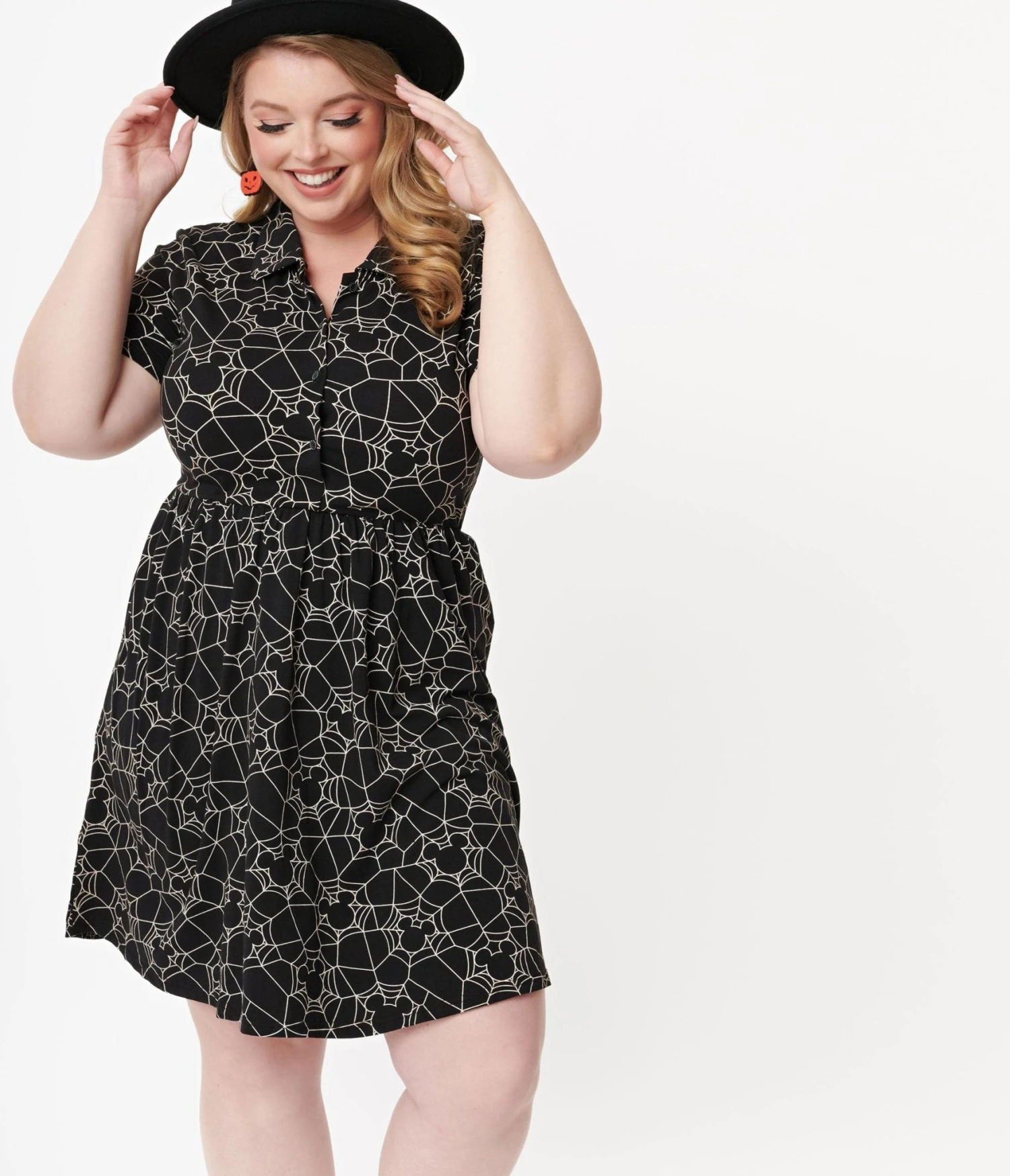 The cutest of creepies and crawlies, gals! This thrilling plus size fit & flare dress from Cakeworthy is crafted in a fabulous black cotton stretch and boasts a playful ivory print of Disney’s Mickey Mouse in a spooky spiderweb pattern. Complete with a button up front and seamed high waist, trick or treat down main street!