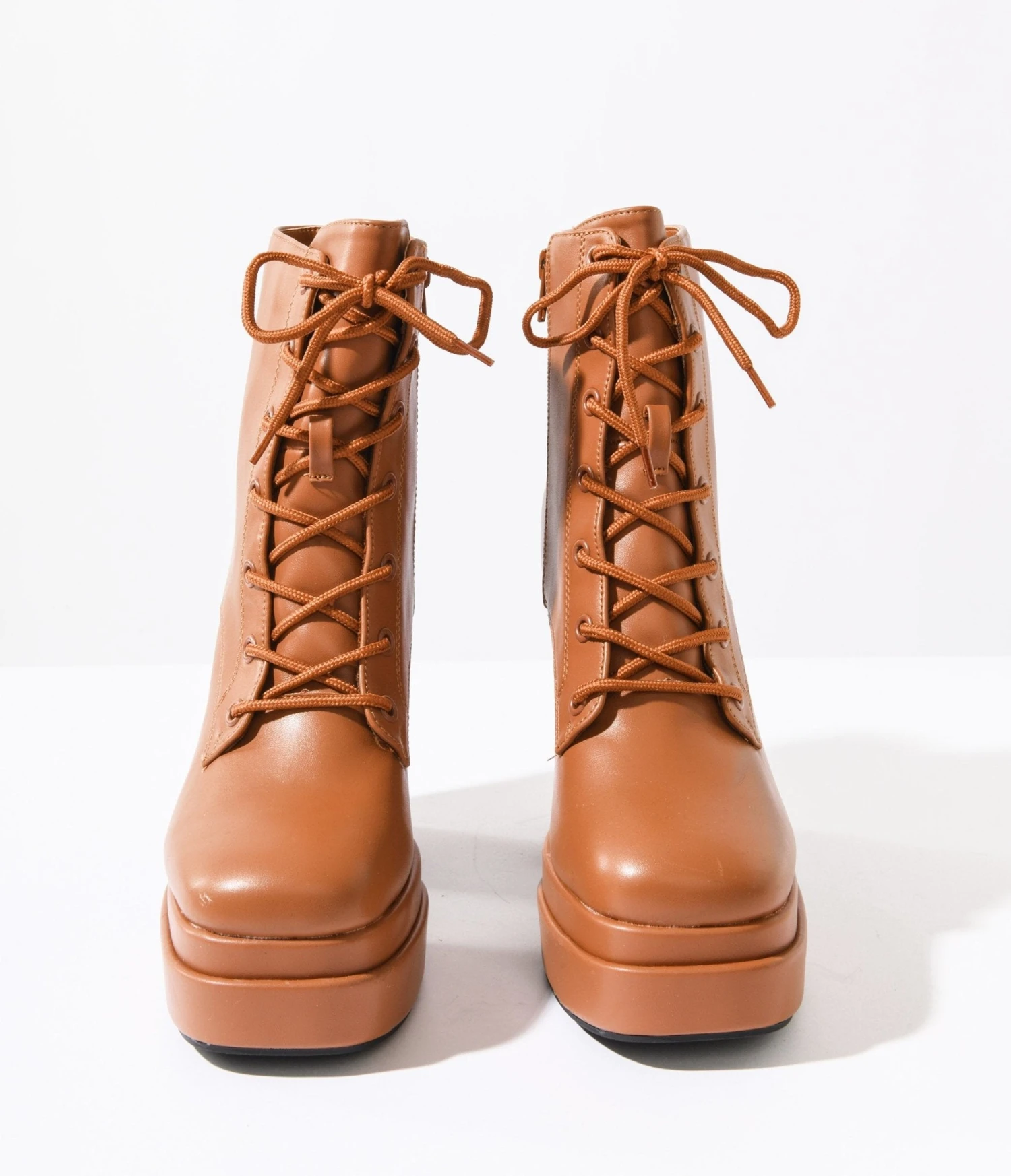 Step up your shoe game with these camel brown leatherette booties! Complete with a lace-up front, side zipper, rounded toe vamp, 1.5 inch platform, and 4.5 inch heels.