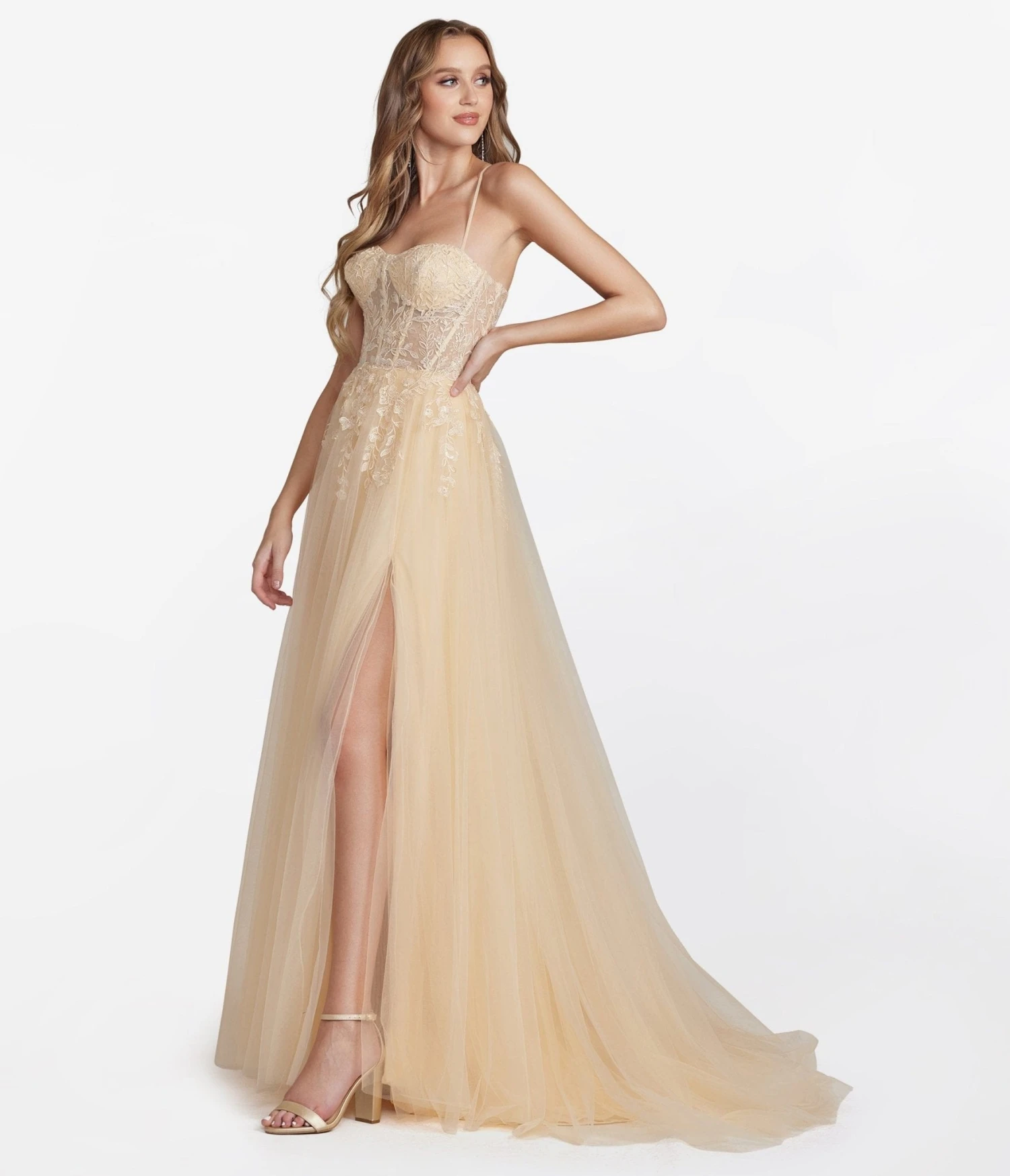 This long A-line prom dress is crafted in a gorgeous champagne colored tulle fabric, topped by a bustier-style sheer-lace corset bodice with thin shoulder straps that criss-cross the open back. The romantic evening gown includes a multi-layered long skirt that gathers at the lacy waist before opening in a side slit and ending at the floor with a figure-flattering a-line shape.