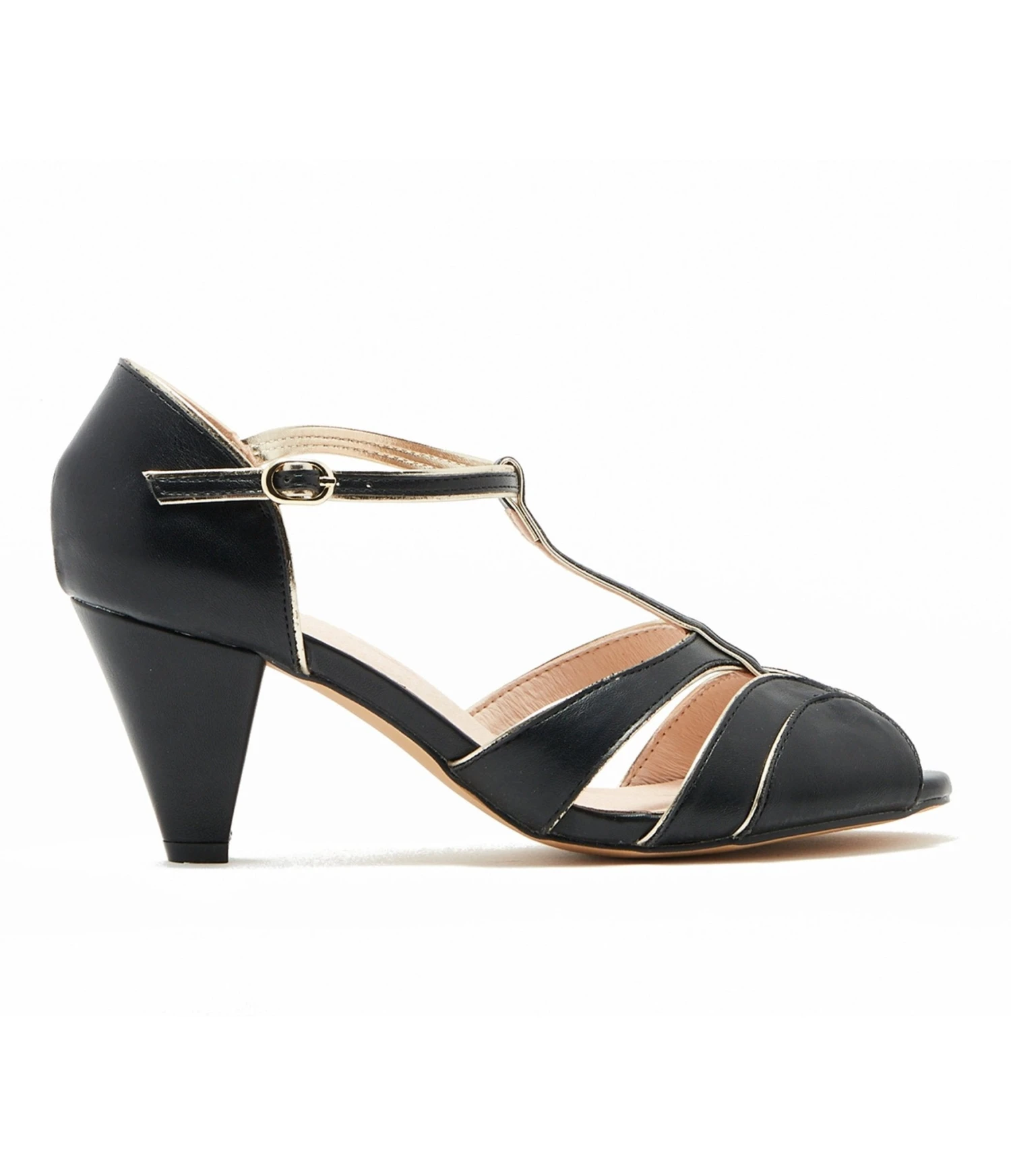Take over the dance floor in these vintage-inspired T-strap heels! Beautifully crafted with a black leatherette and bronze piping, these heels will have you swingin. Complete with a charming peep toe and 2.5 inch tapered heel.