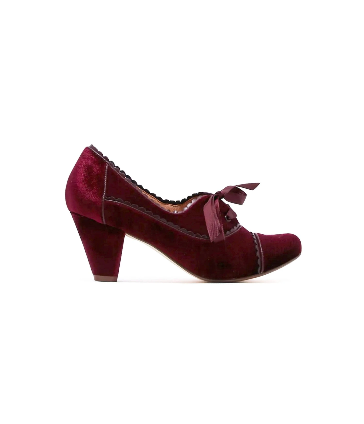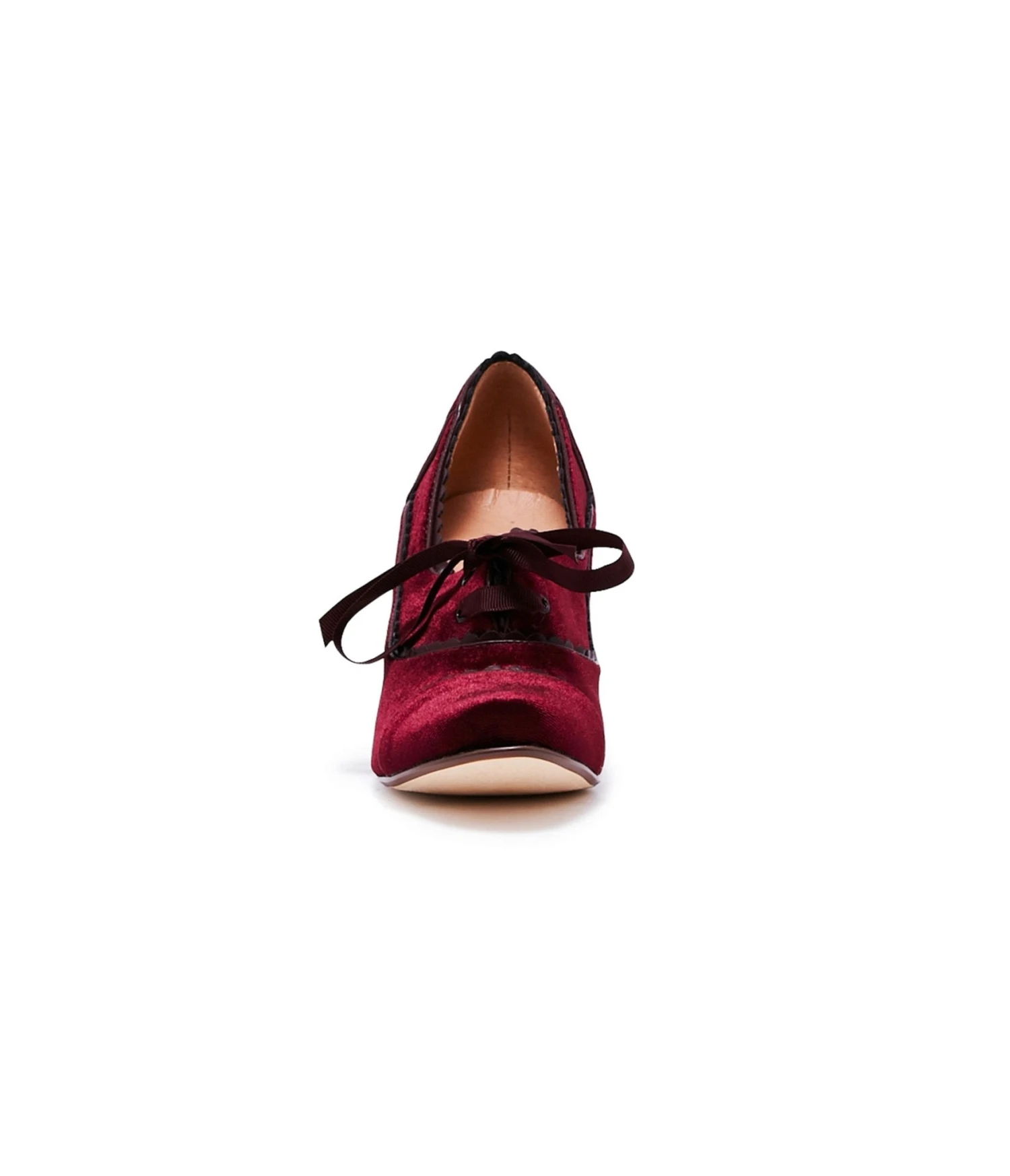Channel gothic academia with beautiful oxford inspired heel crafted in a lovely burgundy velvet. The scalloped low cut collar and grosgrain ribbon laces adds a sultry touch. Complete with a 2.5 inch heel.