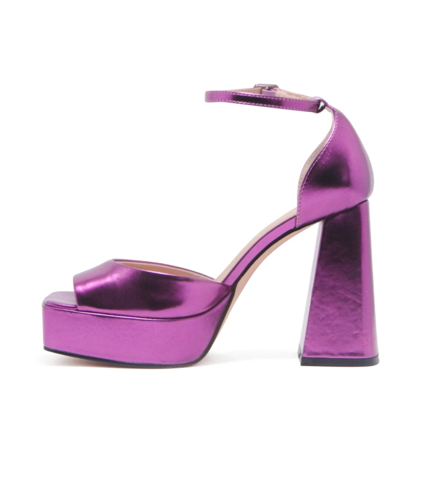 Be the star in these showstopping platform heels! Crafted in a vibrant metallic pink leatherette, these heels will shine every step of the way with the buckle closure keeping them secure. Complete with a 1 inch platform and a 4.5 inch heel.