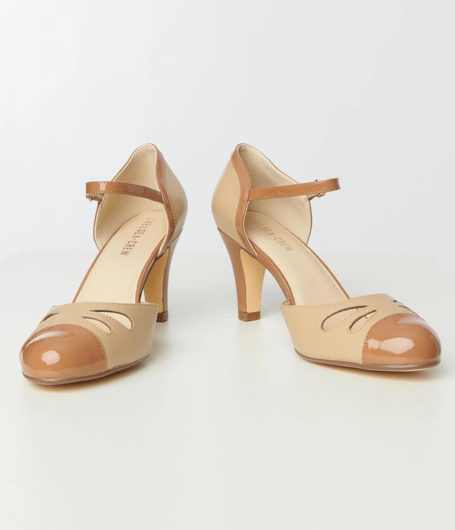 These sweetheart kicks are crafted in a fabulous nude cream leatherette and boasting tan patent leatherette accents, this darling d’Orsay cut features cutouts on the vamp. Complete with adjustable ankle strap, 3 inch heel, and leather insole.