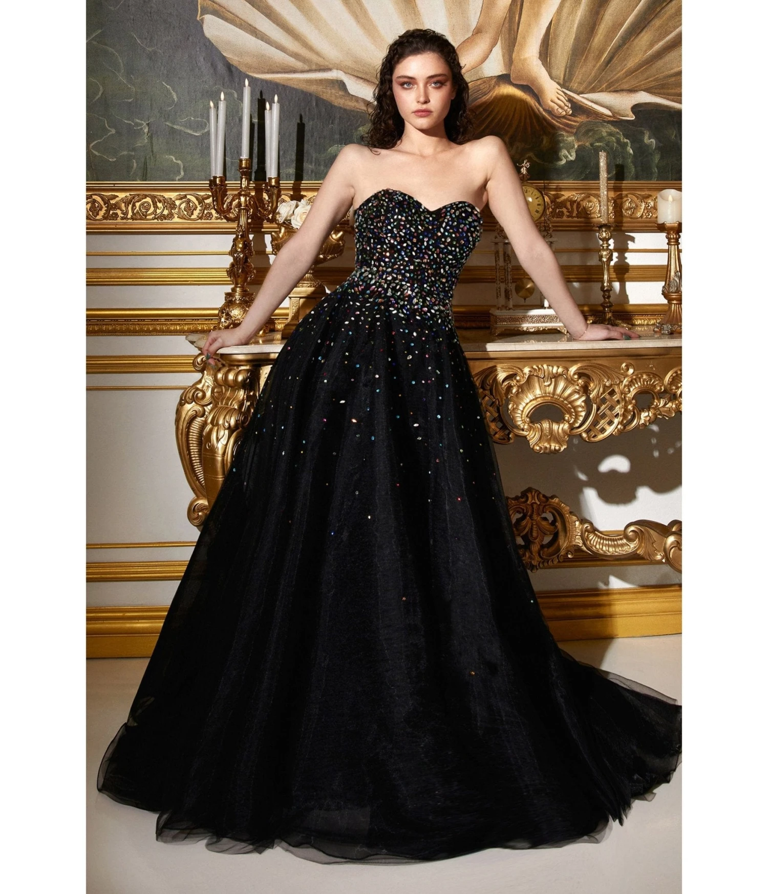 Make a statement when you enter the room with this beautiful black ball gown dazzling with rainbow jewels descending from the bodice onwards. The strapless sweetheart neckline drops perfectly into the multi-layered tulle skirt for extra volume and drama.