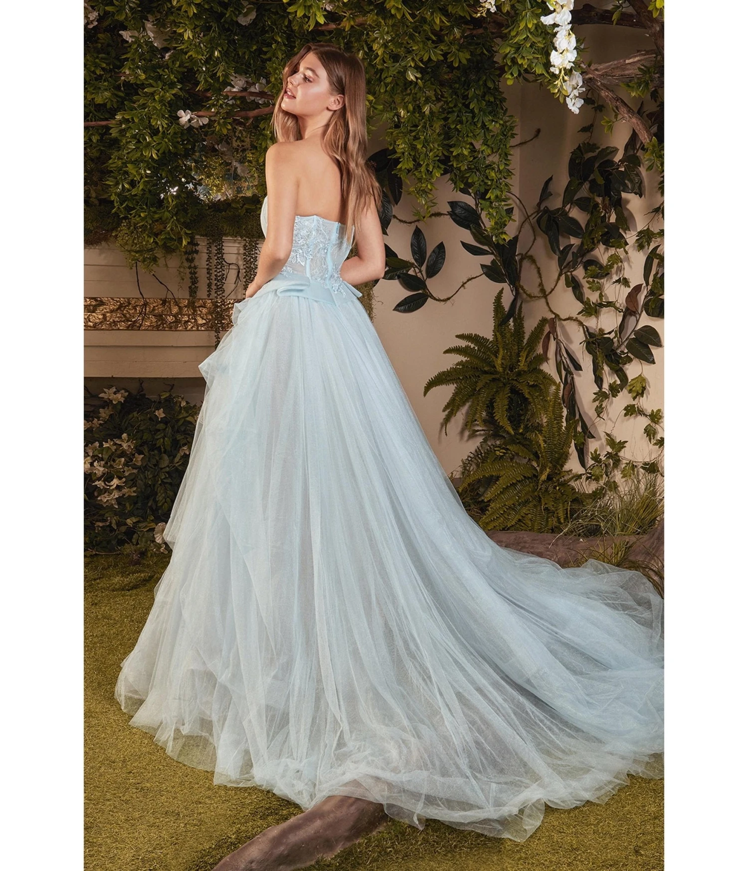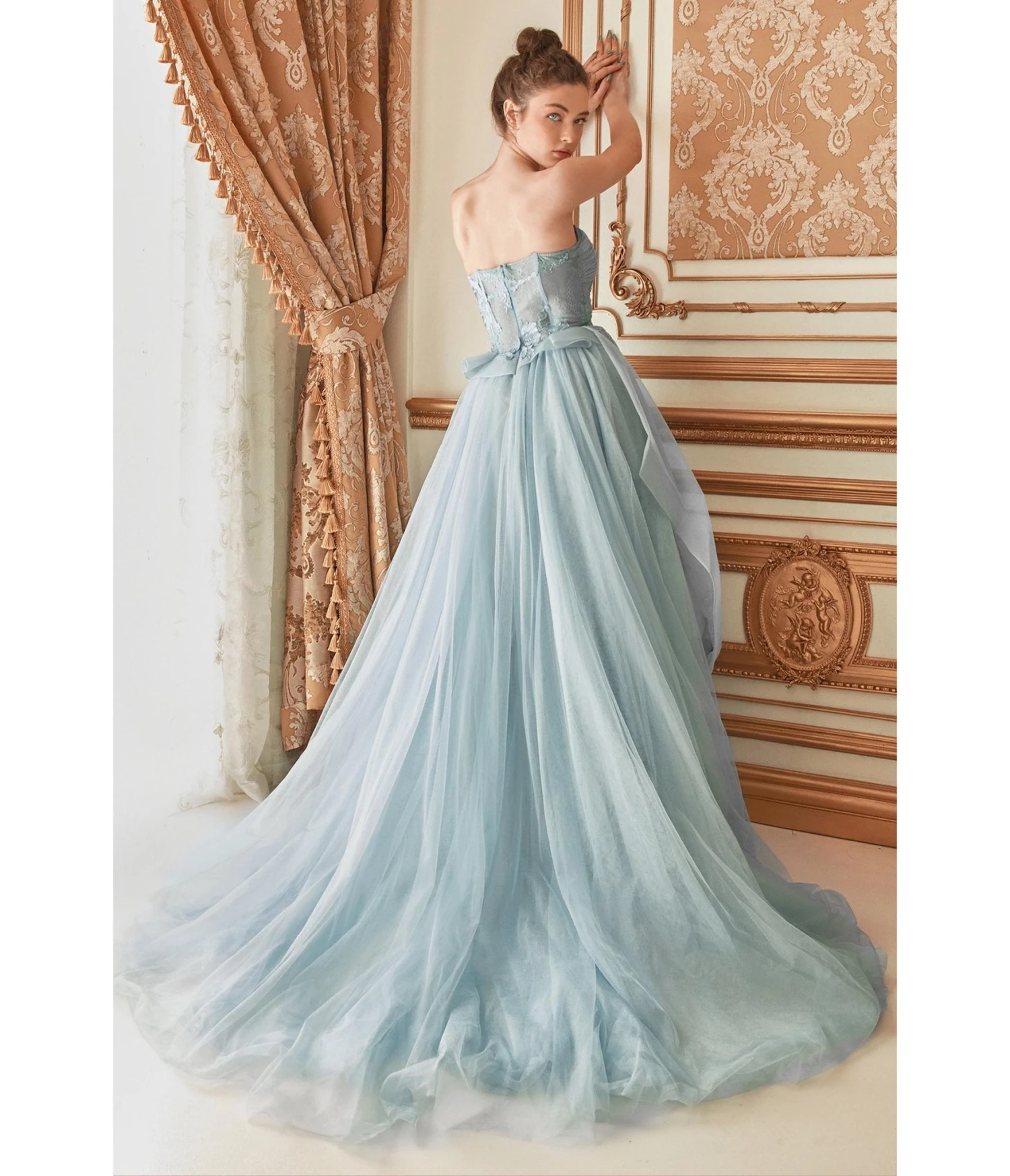 This exquisite masterpiece, crafted from a delicate pale blue tulle fabric, effortlessly embodies sheer luxury. The strapless corset bodice structure provides an alluring silhouette while the open mid-rise back adorned with a zipper closure adds a touch of sensuality. Indulge in pure opulence as layers of asymmetrical peplum accents gracefully wrap around your waistline, creating a captivating visual feast that will leave onlookers enchanted. The glittering floor-length A-line draped skirt cascades down, exquisitely embellished with embroidered details that sparkle like stardust. And let us not forget about the pièce de résistance – the grandiose court train that trails behind you, leaving an unforgettable impression wherever you go.