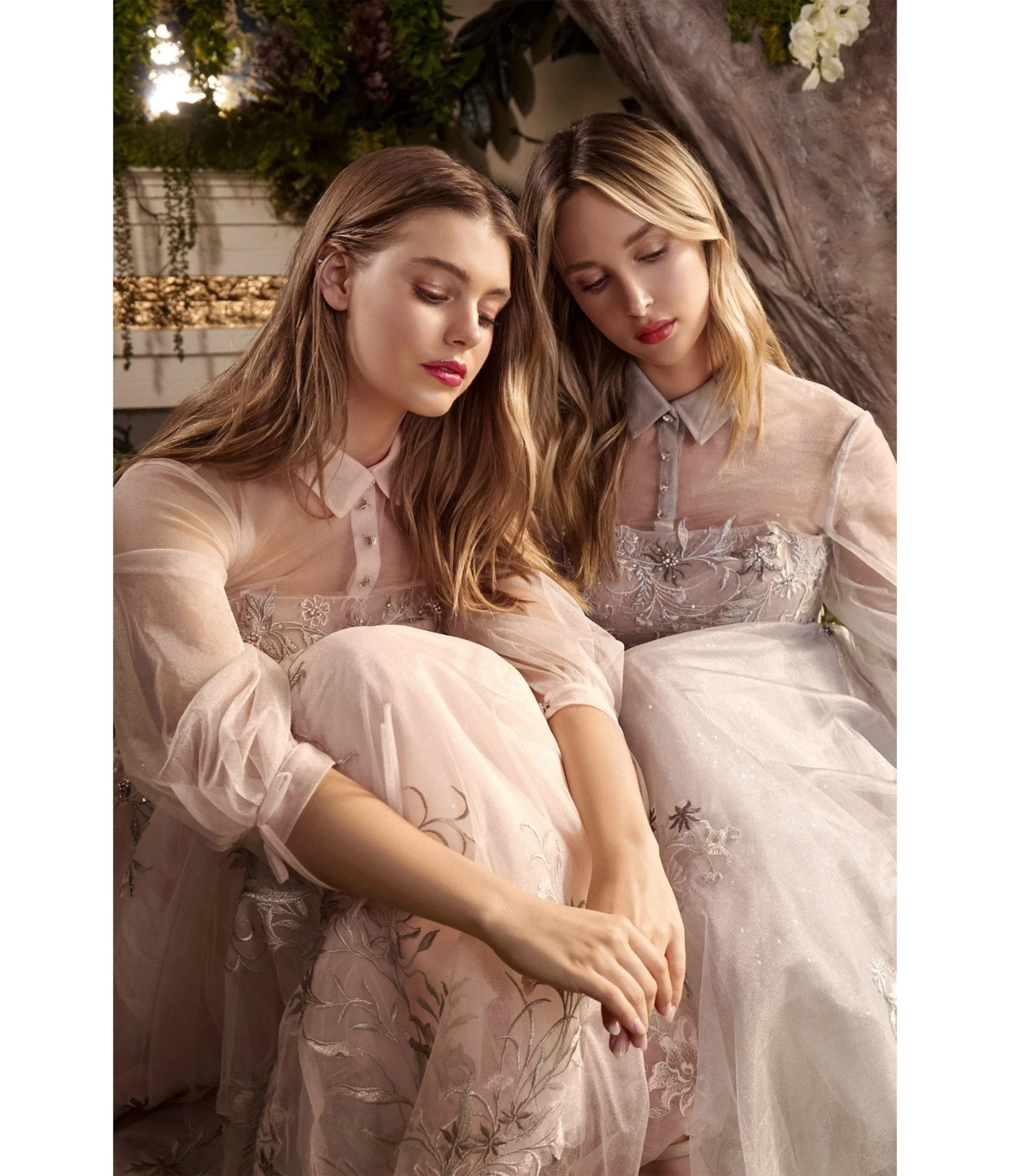 Crafted with meticulous attention to detail, this exquisite dress will charm and captivate all who behold it. The blush tulle fabric drapes gracefully, adorned with intricate floral embroidered lace that entwines delicately through its surface. An enchanting illusion collar adds ethereal allure, framing your delicate features with grace and sophistication. A corset bodice cinches at the waistline, accentuating your natural curves and lending an air of regality to your silhouette. Every movement is made more awe-inspiring as you fasten up the glass beaded buttons that adorn the front – each glimmering bead enticingly catching the light. Sheer quarter blouson tulle sleeves cascade from your shoulders like whispers of pure bliss, their transparency allowing glimpses of bare skin while adding an element of sensual mystery. Turning heads is guaranteed as you reveal the enclosed sheer back with captivating buttons and zipper closure – a stunning surprise from behind. Combining classic elements with modern design touches, this short tea length A-line skirt completes the ensemble exquisitely. Its gentle sway grants graceful movement when you walk or dance, making every step feel like a waltz on clouds.
