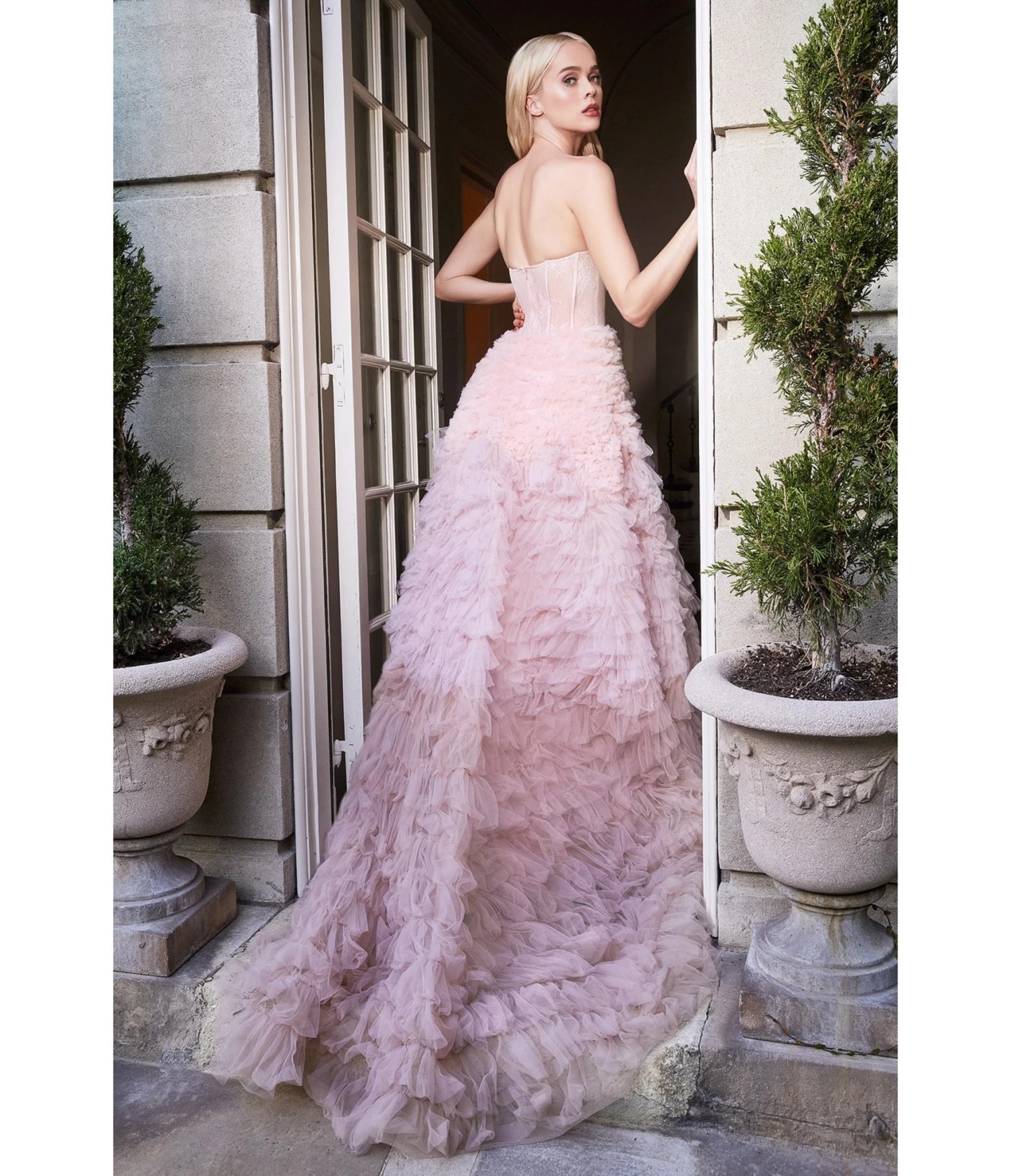 Adorn yourself in a mesmerizing blush colored masterpiece that will leave all eyes on you as you gracefully sway across the room. This strapless sweetheart chantilly sheer corset bodice effortlessly accentuates your every curve, adorned with delicate glass beading and intricate eyelash lace at the cup. Allow your beauty to shine from within as the open corset back reveals adjustable lace-up ties, giving you a perfect fit tailored to your desires. The floor length A-line silhouette flows dreamily into a breathtaking two-color ombre ruffled tulle skirt that swirls around you like waves of pure luxury.