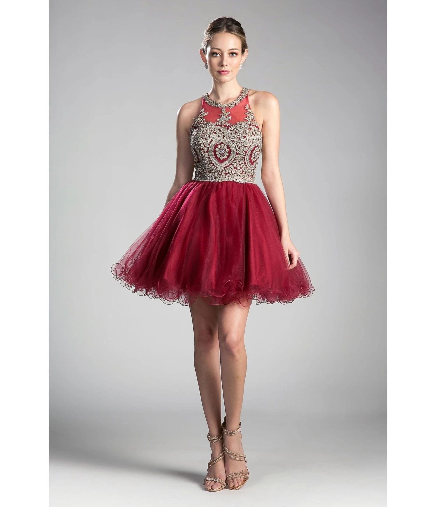 This glamorous burgundy ensemble boasts a short hem rolled tulle skirt, effortlessly capturing the grace of a prima ballerina. The sleeveless illusion bodice beautifully showcases intricate gold beaded lace appliques, adding a touch of opulence to this enchanting attire. Prepare to steal the spotlight as you turn heads with its embellished cutout open back design, perfectly accentuated by a delicate back zipper closure. Crafted with utmost attention to detail and fully lined bra cups for maximum comfort, this remarkable dress embodies sophistication at its finest.