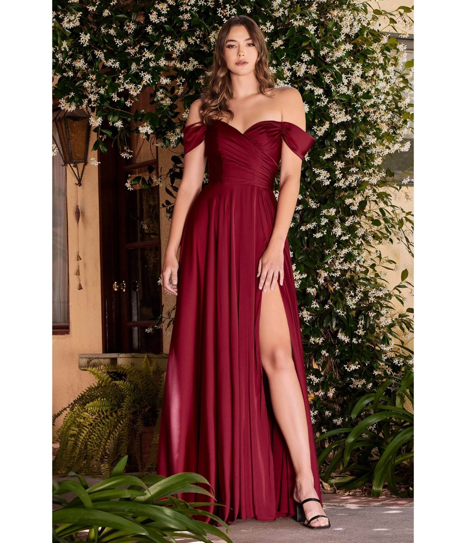 This burgundy satin A-line gown features a simple sweetheart neckline that gathers around the waistline flowing into a light slitted skirt. Complete with an off the shoulder silhouette and back zipper.