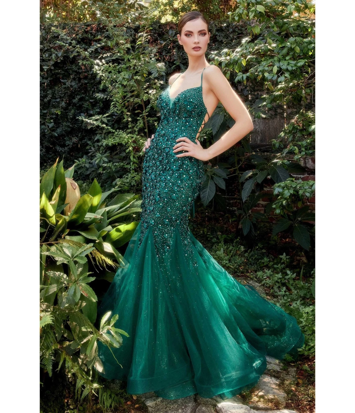 Bloom all year round with this enchanting emerald mermaid dress. The stunning fitting mermaid silhouette is adorned with 3D floral appliques, cascading into the luxurious tulle fishtail. Complete with an open lace back for a touch of romance.