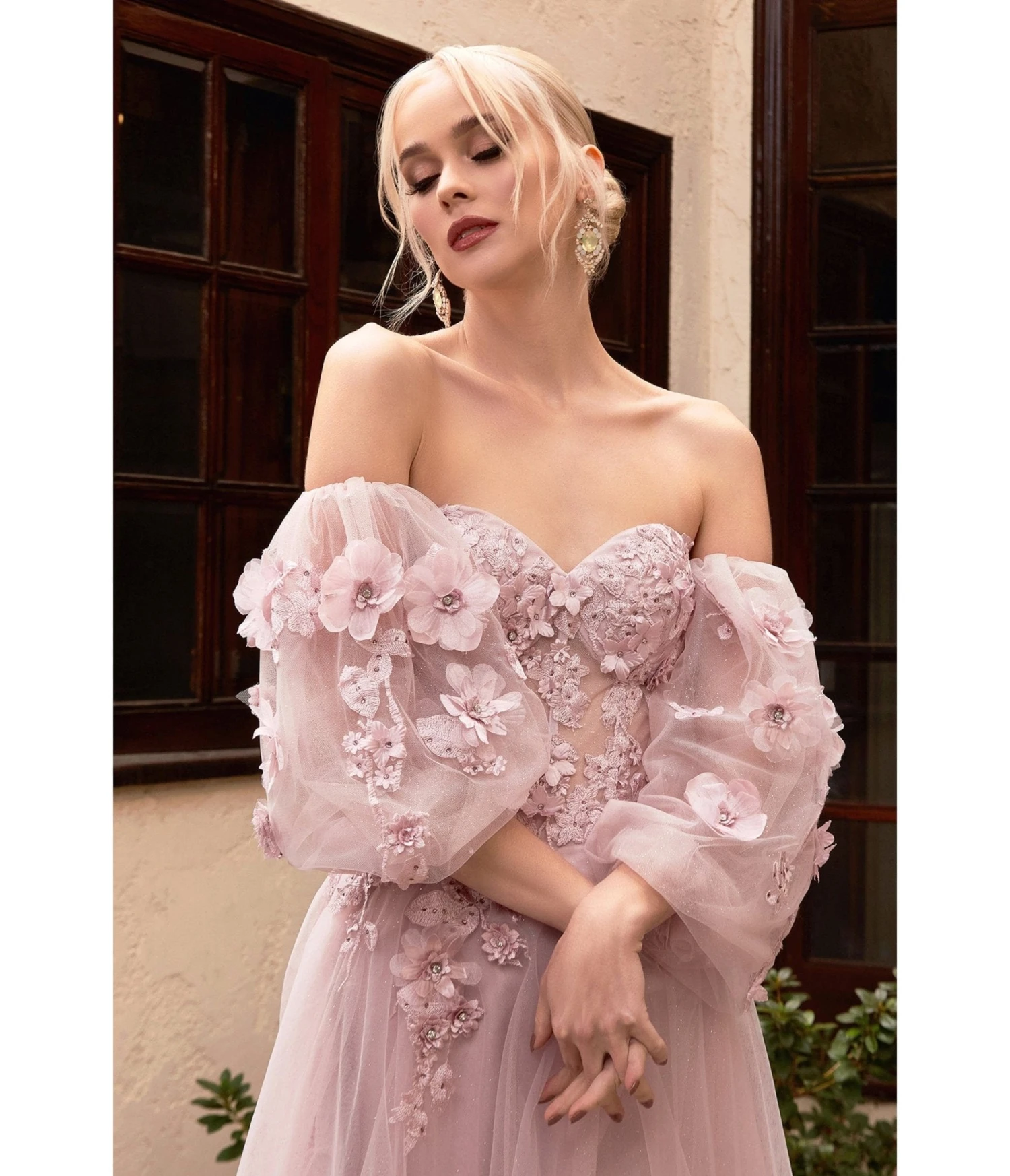 This magical mauve dress is perfect for any fairytale princess. Crafted in layers of tulle paired with a sheer tulle corseted bodice, embellished at the bust with blooming floral appliques. The lace applique strapless sweetheart neckline is framed with detachable off the shoulder blouson sleeves. Twinkle and shine in this beautiful dress!