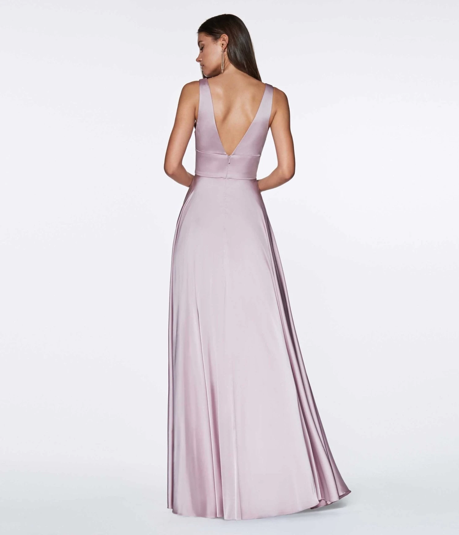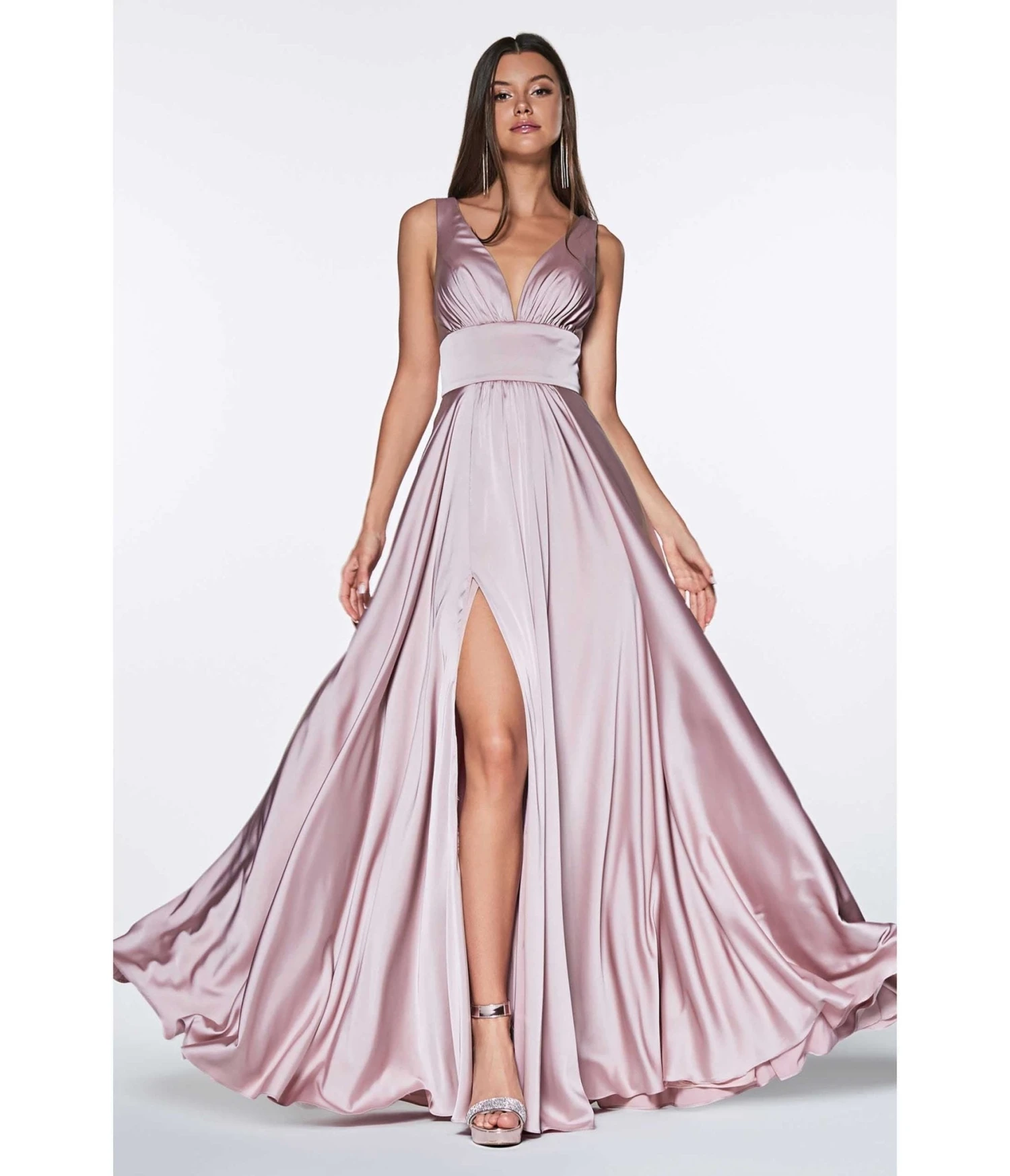 This mauve satin bridesmaid dress is an a-line empire cut dress. The deep v-neckline has a shirred bust complete with wide tapered shoulder straps and a wide waistband. The flowing skirt features a sultry side slit.