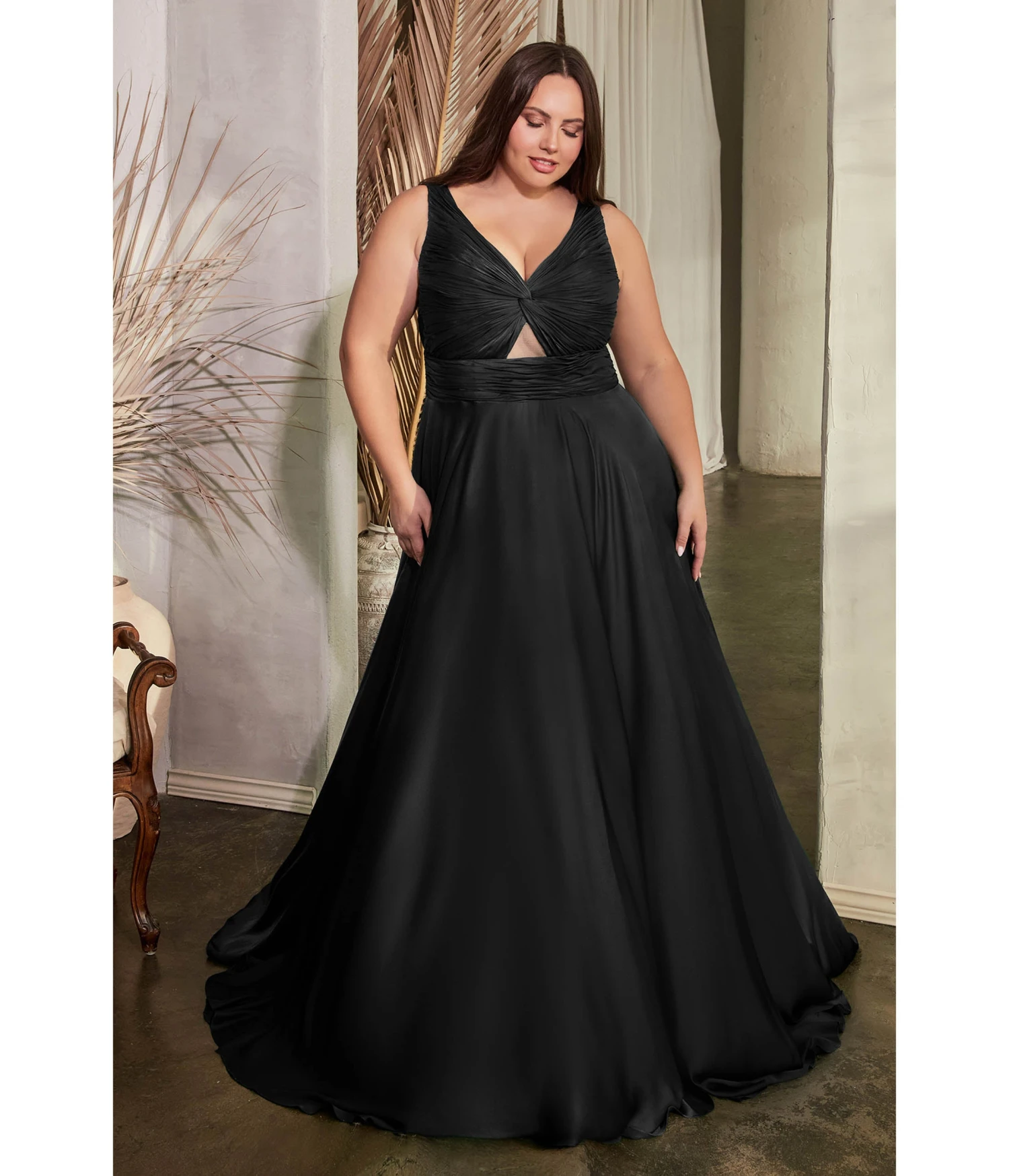 Exude a charm that is meant to enthrall the crowd in this black satin creation. This sleeveless plus size gown showcases ruched details on the top bodice with a knotted front and keyhole cutout. The wide waistband defines your waist beautifully for a slimmer look. It also features a v-neckline and mid-open v-shaped back, with wide shoulder straps that provides an ample support. Lastly, the skirt forms an A-line silhouette that descends to the floor.