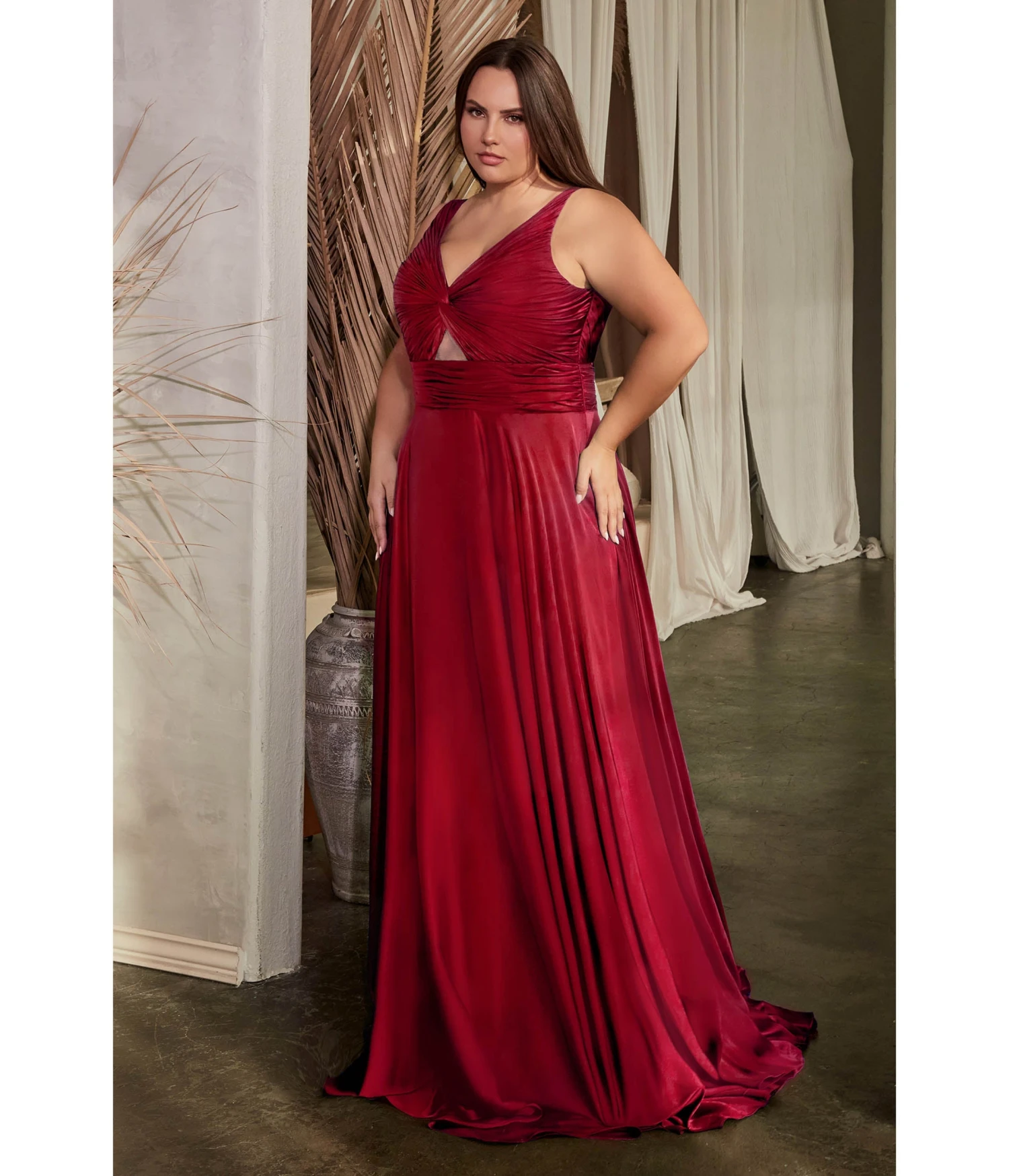 Exude a charm that is meant to enthrall the crowd in this burgundy satin creation. This sleeveless plus size gown showcases ruched details on the top bodice with a knotted front and keyhole cutout. The wide waistband defines your waist beautifully for a slimmer look. It also features a v-neckline and mid-open v-shaped back, with wide shoulder straps that provides an ample support. Lastly, the skirt forms an A-line silhouette that descends to the floor.