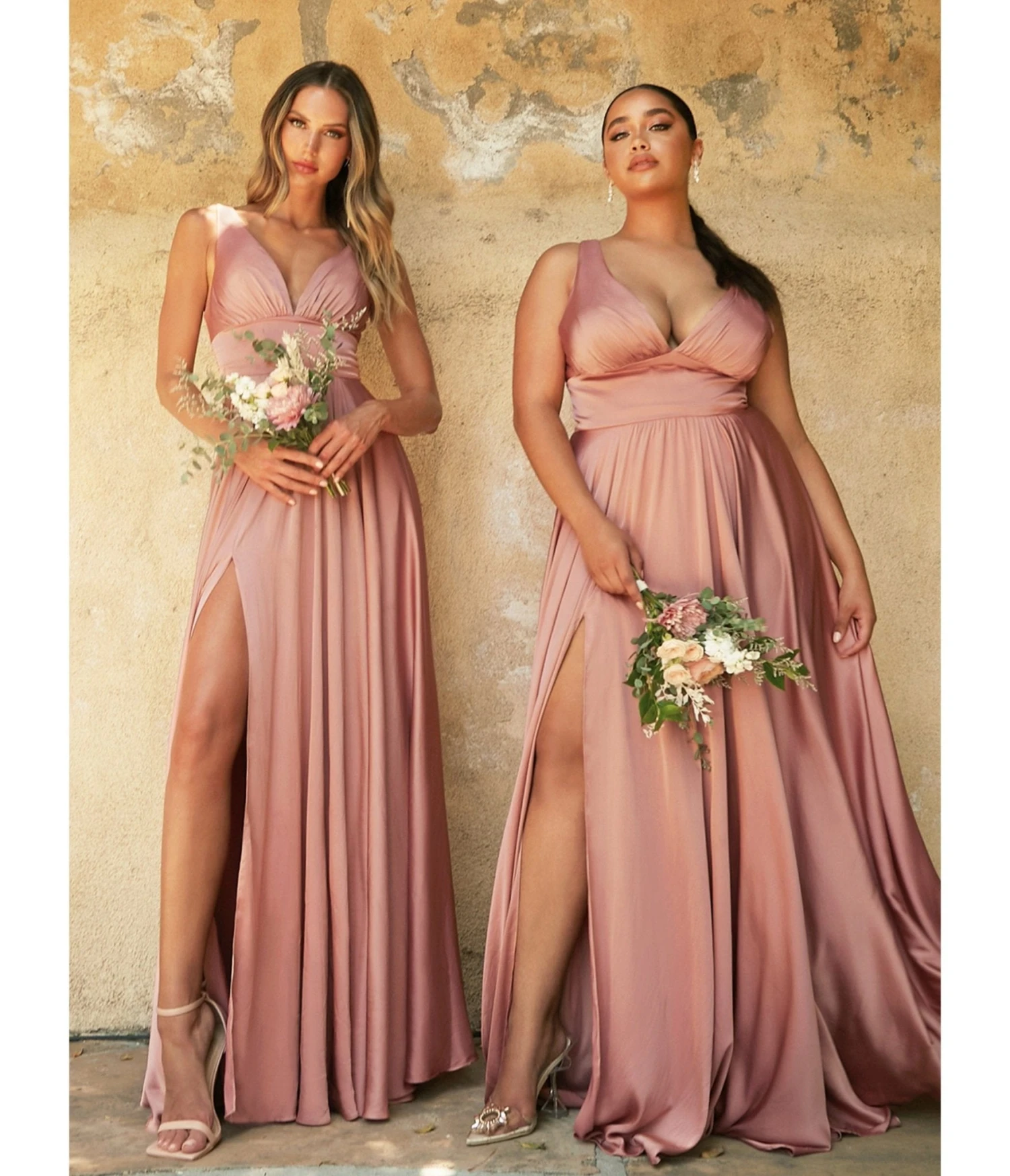 This plus size rose gold satin bridesmaid dress is an a-line empire cut dress. The deep v-neckline has a shirred bust complete with wide tapered shoulder straps and a wide waistband. The flowing skirt features a sultry side slit.