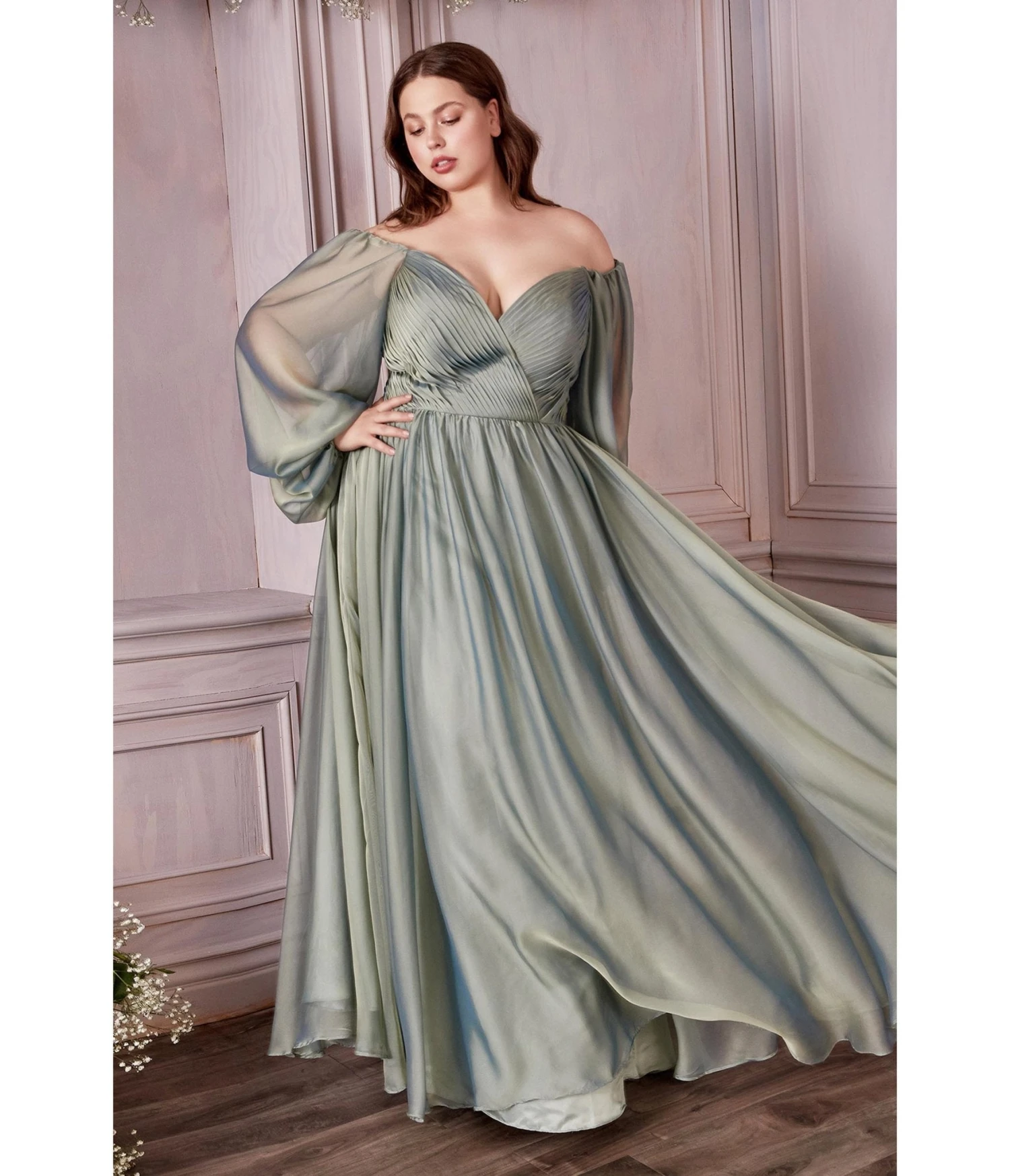 This breathtaking plus size gown is crafted in a stunning sage chiffon fabric that floats over a matching lining. The sweetheart bodice features pleating throughout, and is framed with sheer long sleeves, while the dramatic full length skirt boasts a small train.
