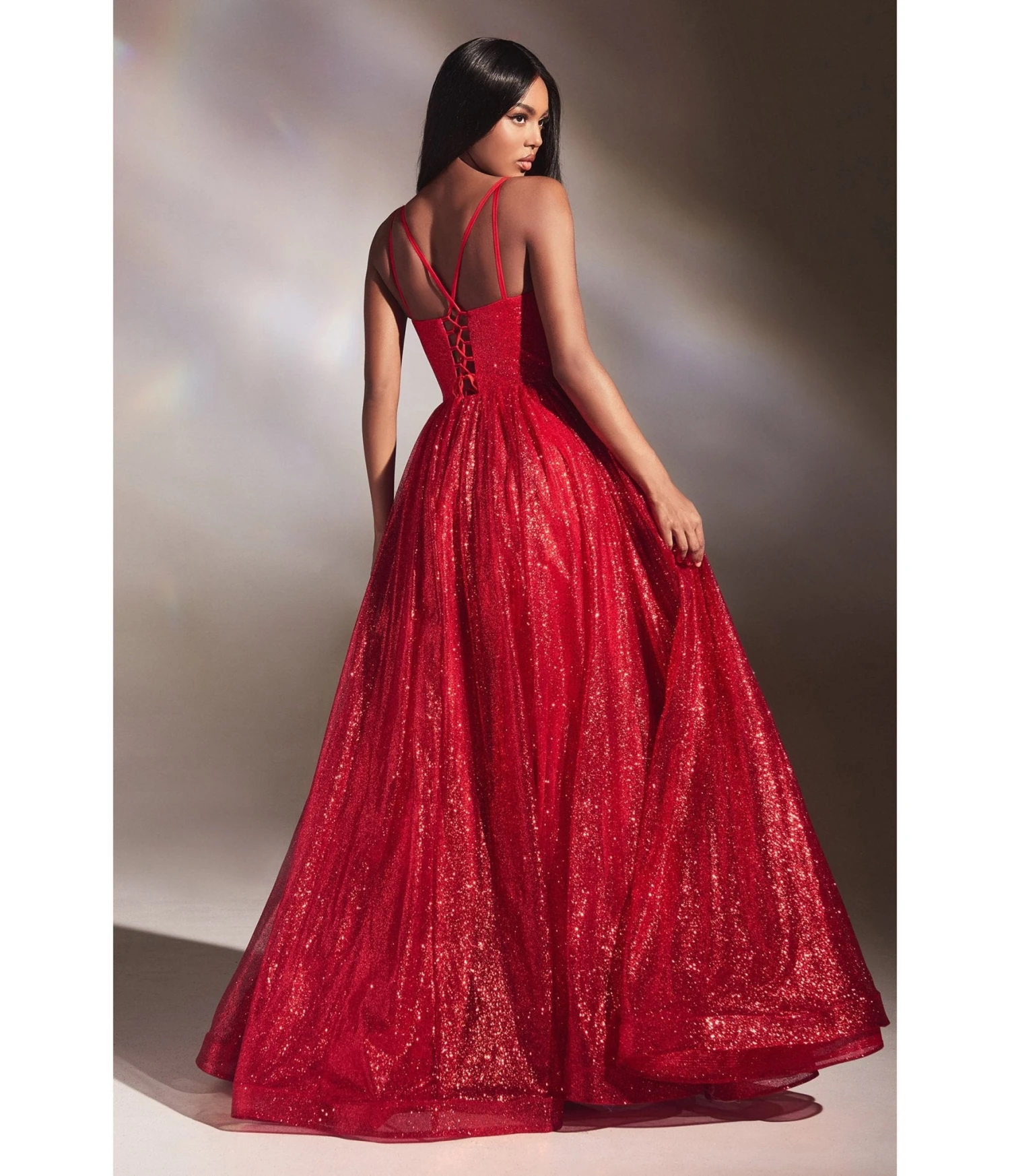 Crafted to perfection, this magnificent ball gown features a mesmerizing red glitter fabric that shimmers like stardust under the moonlit sky. Its deep open illusion sweetheart neckline bodice beautifully showcases your décolletage while the delicate double spaghetti straps gracefully adorn your shoulders. As you turn heads with every step, the open lace-up back unveils a tantalizing glimpse of your innate charm. Its equipped with a zipper closure that ensures effortless wearability without compromising on style. The floor-length A-line skirt gracefully cascades down in majestic fashion, accentuating your silhouette as it flares out in all its splendor. To truly make a grand entrance at any event, the sweeping train adds a sense of regality as it trails behind you like a cascade of stardust.