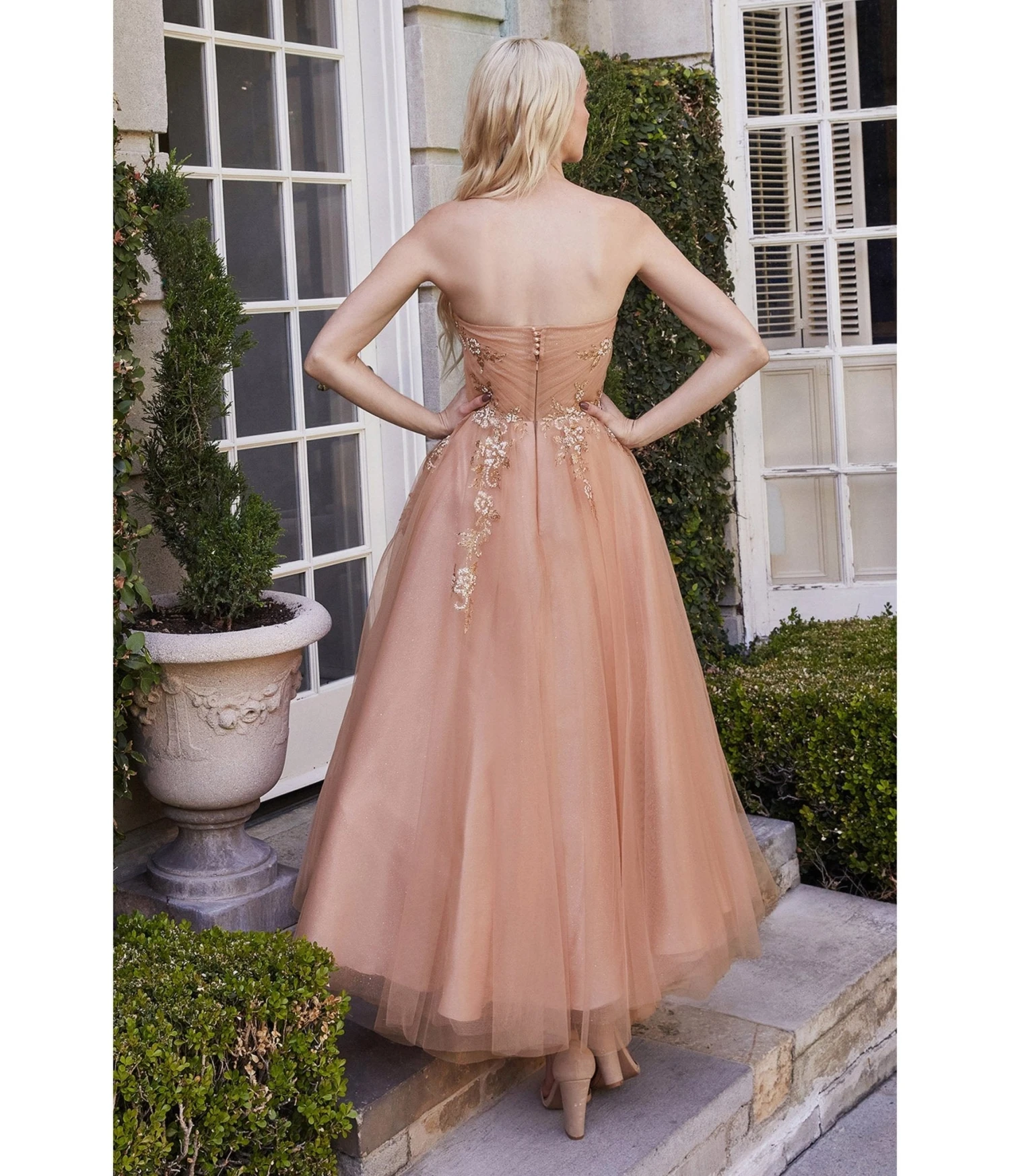 This enchanting gown boasts a mesmerizing combination of delicate rose gold tulle and ornately embellished embroidery, creating an ethereal masterpiece that is sure to captivate all who lay eyes upon it. The ruched strapless sweetheart bodice is pure elegance, while the mid-rise open back emanates a touch of allure, complemented by zipper and button closures that exude sophistication at its finest. The tea length A-line skirt gracefully cascades around you as you glide through any occasion, leaving behind an ambiance of sophistication and grace.
