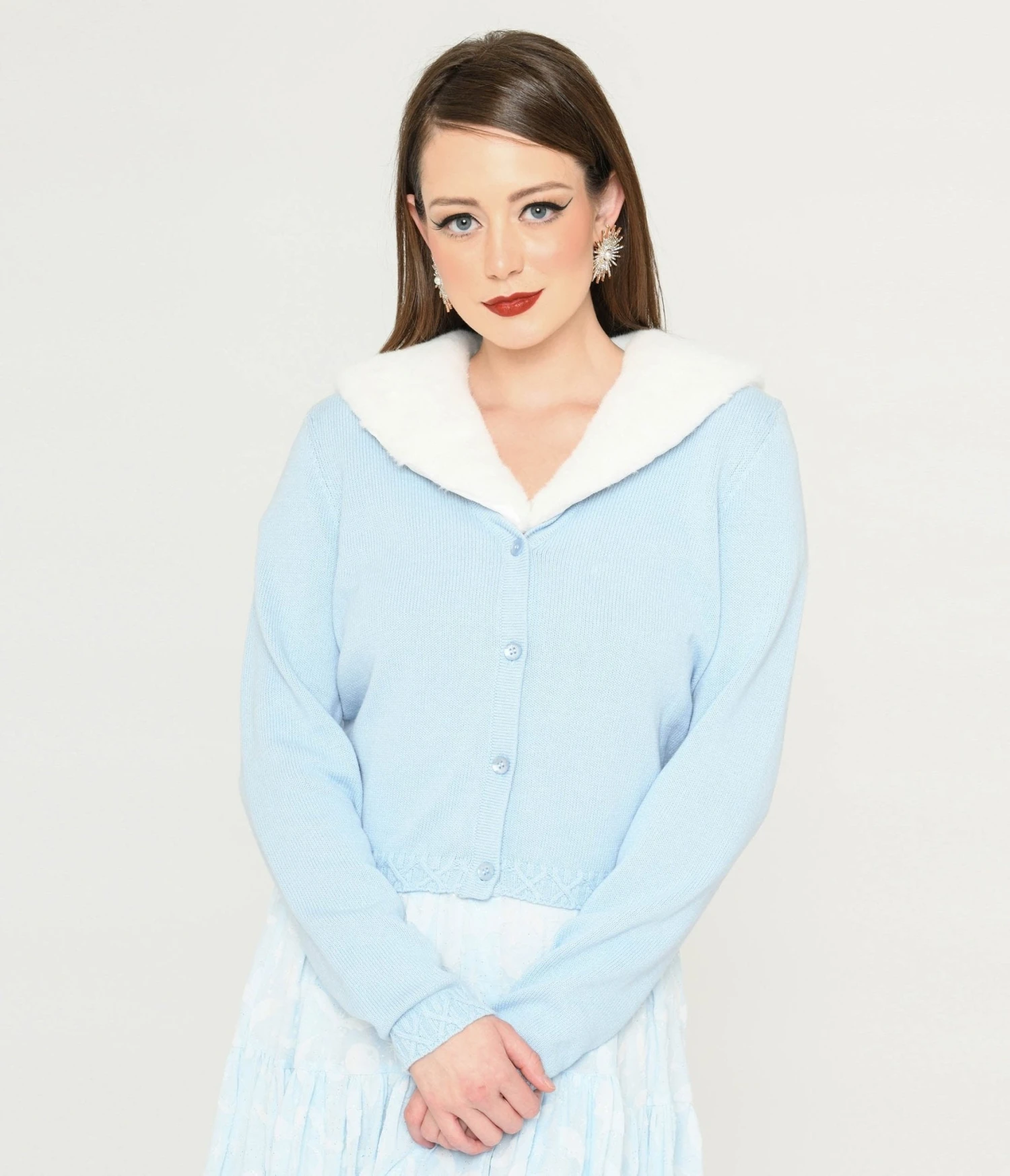 This darling cardigan from Collectif is crafted in a light blue sweater knit and boasts a button front, and a removable white faux fur collar!