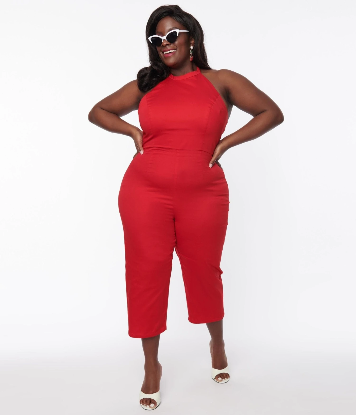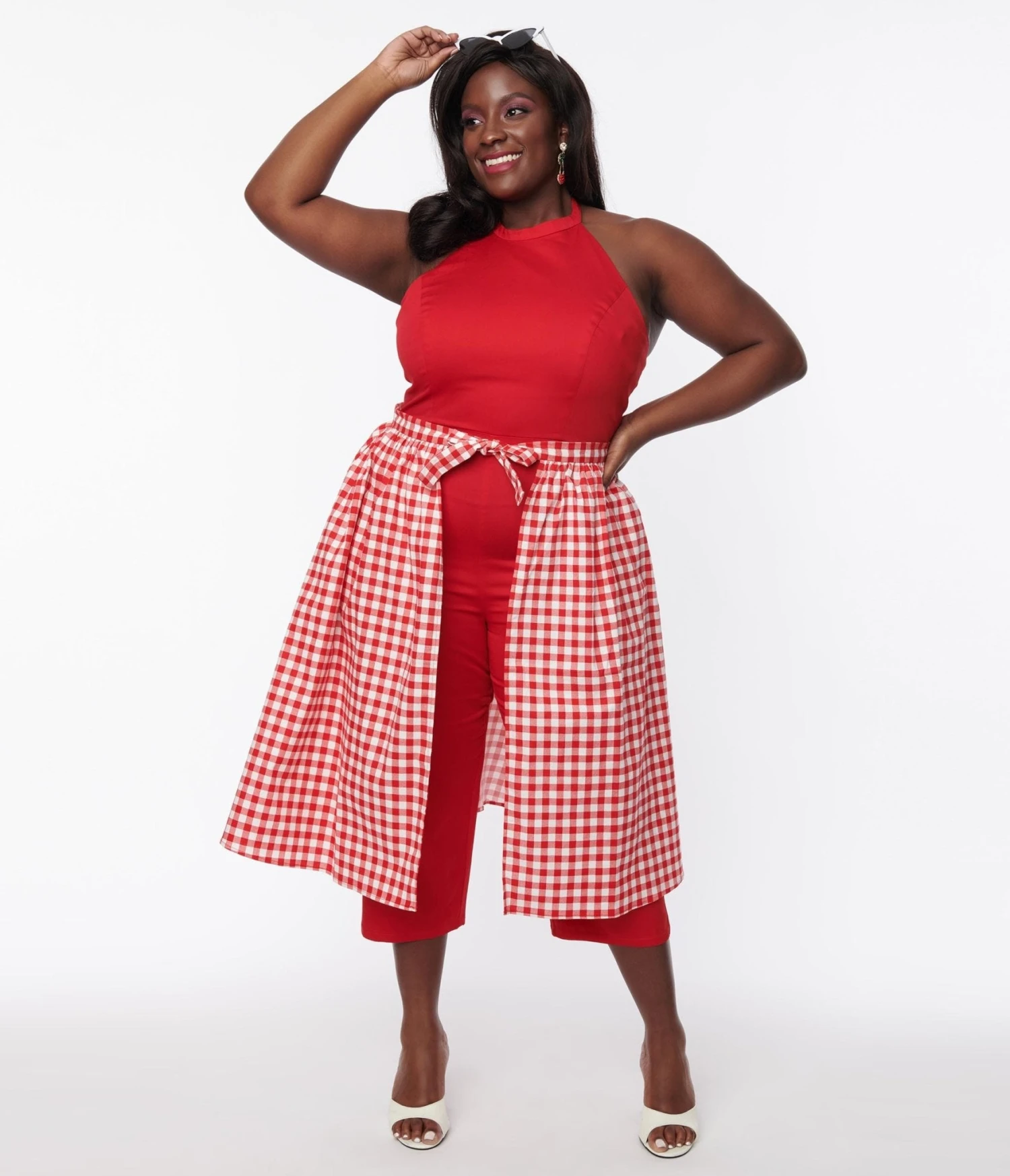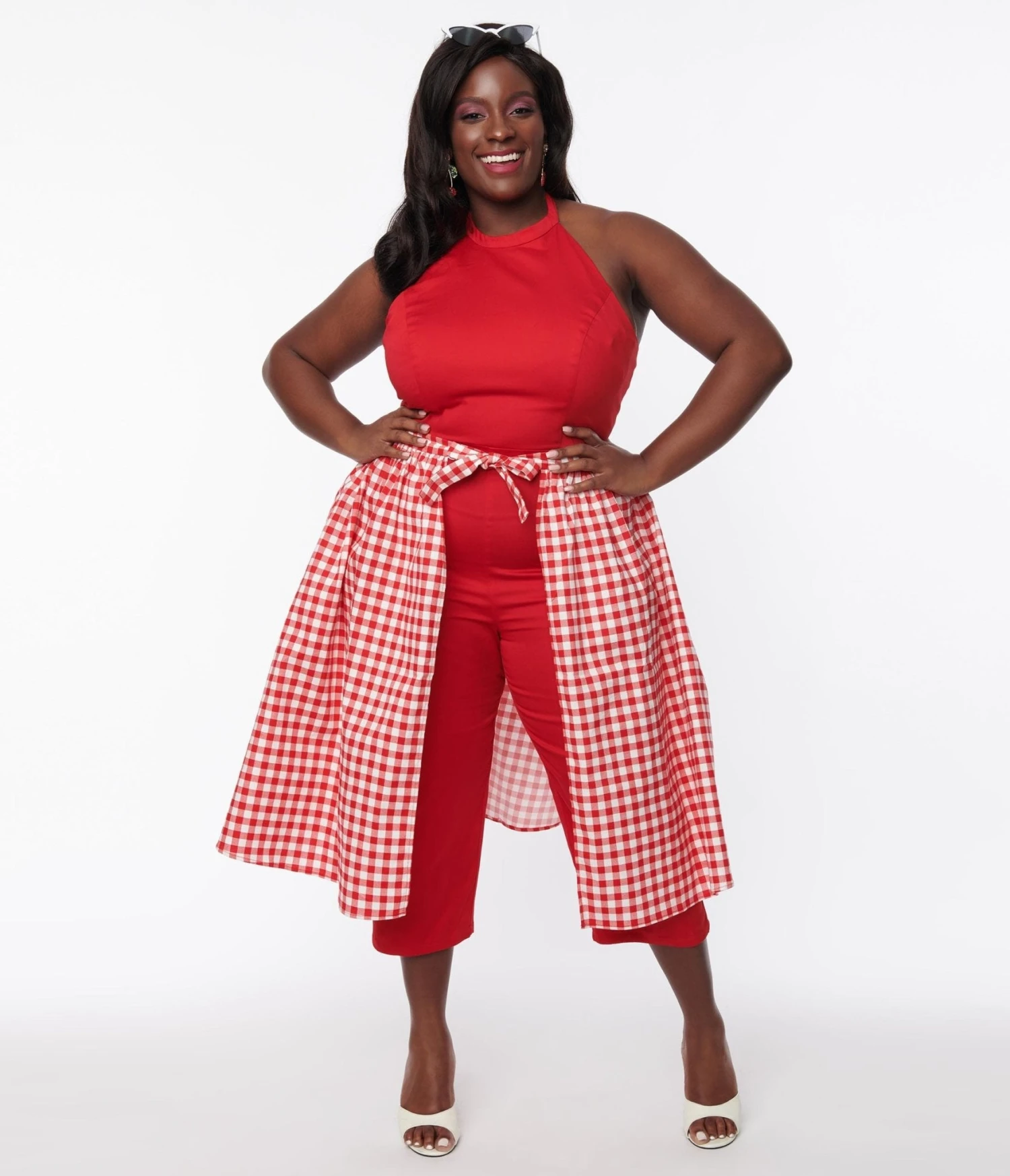 This bright and beautiful plus size jumpsuit from Collectif is crafted in a cotton blend to hug your body in all the right places in a bold red. Boasting a halter neckline and complete with a back zipper. This unique piece is accented with a charming self-tie red and white gingham skirt for an extra flare!
