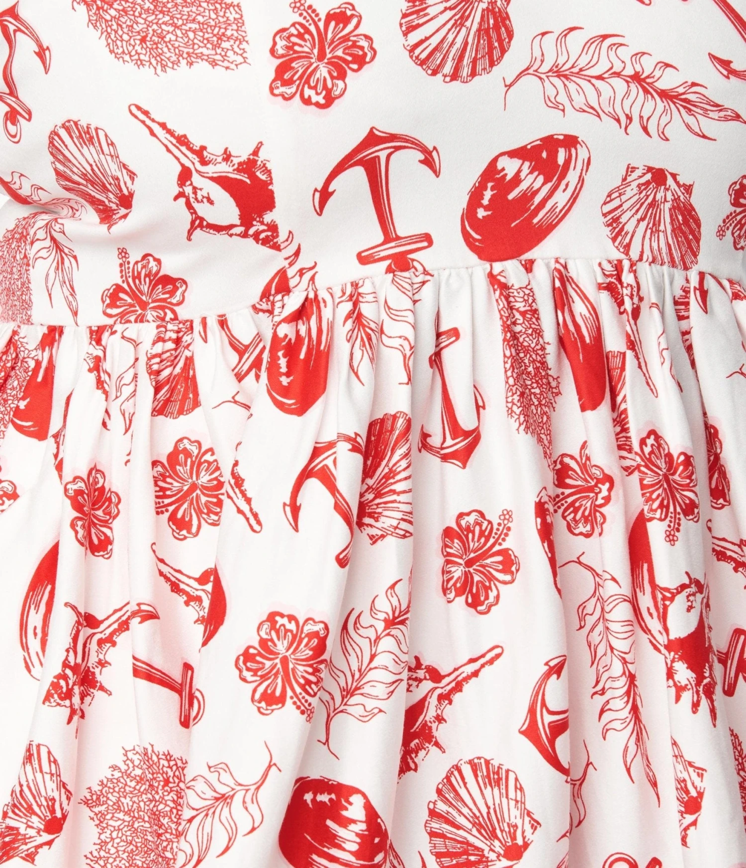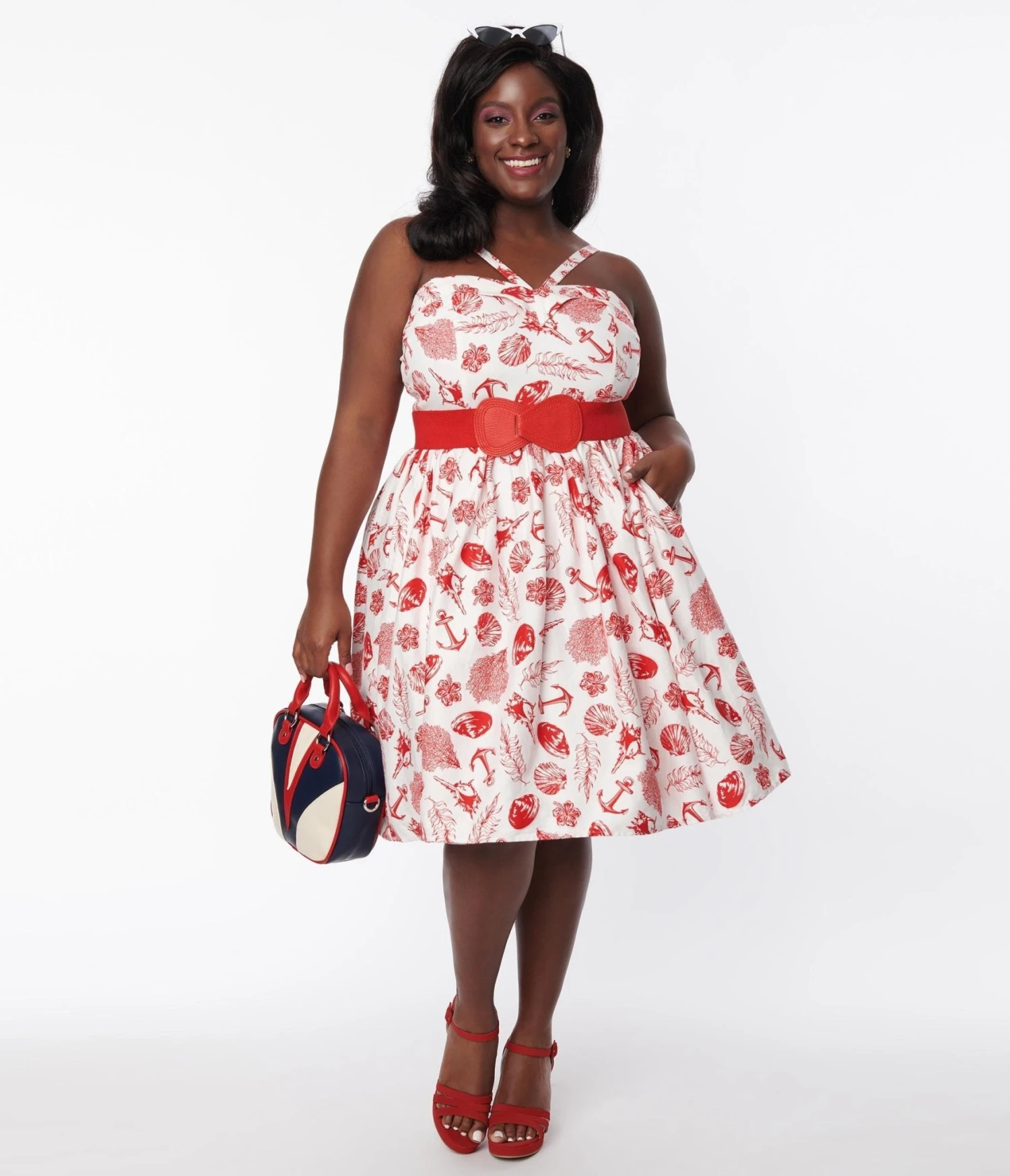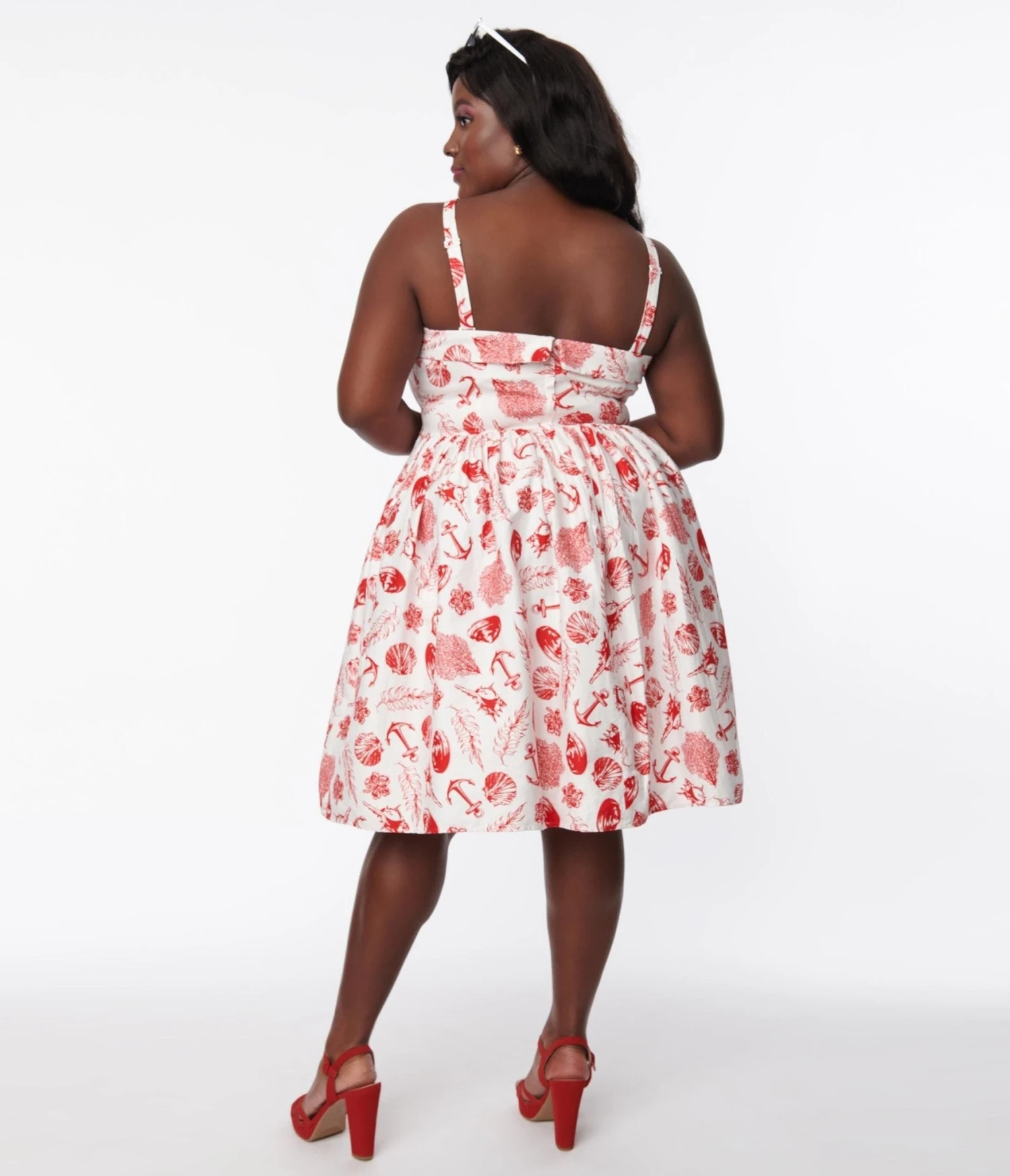 This charming 1950s style swing dress from Collectif is crafted in a cotton blend that dances with a red sea side print motif featuring sea shells, anchors, and seaweed throughout the white backdrop. Complete with removable straps that accent the sweetheart neckline, and a full swing skirt featuring side pockets.