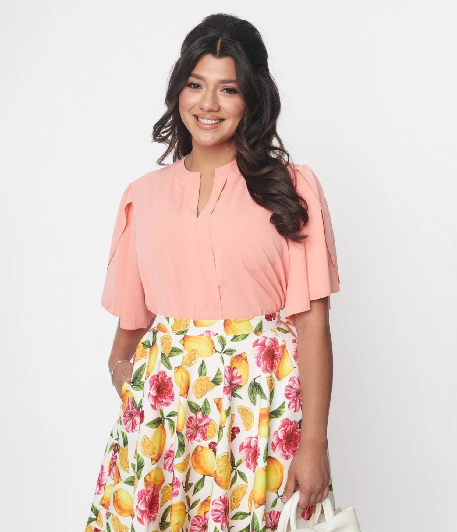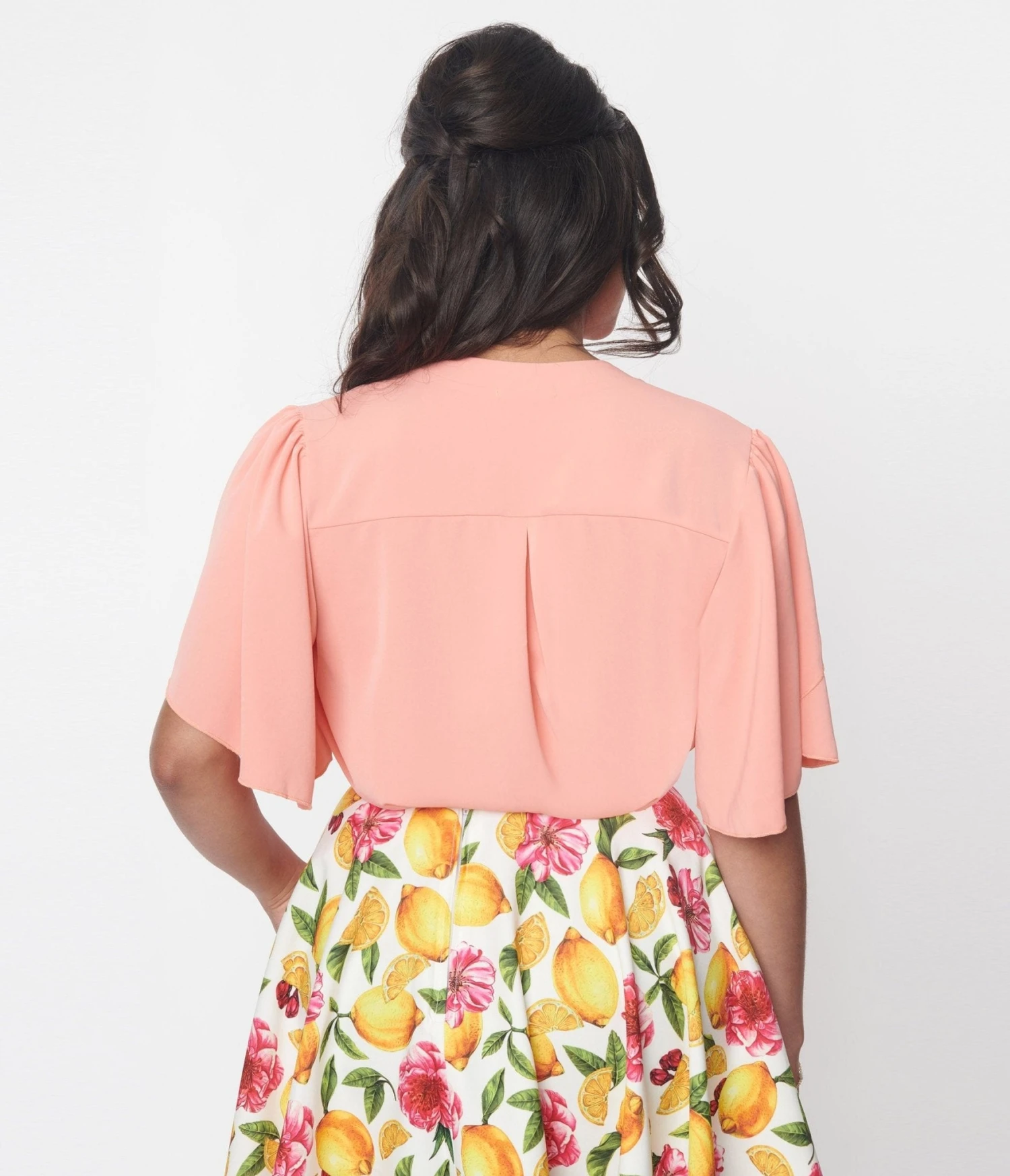 This darling blouse is set in a coral woven and outfitted with a V neckline leading to a pleated center. Complete with short flutter sleeves.